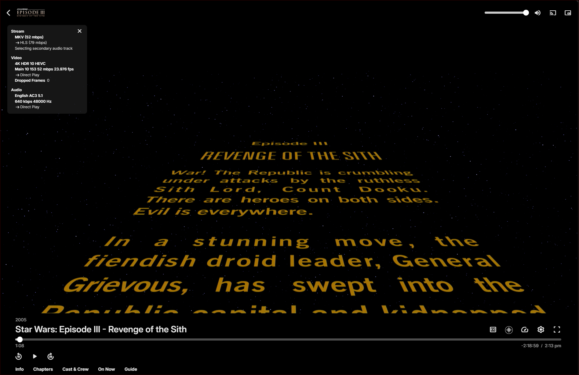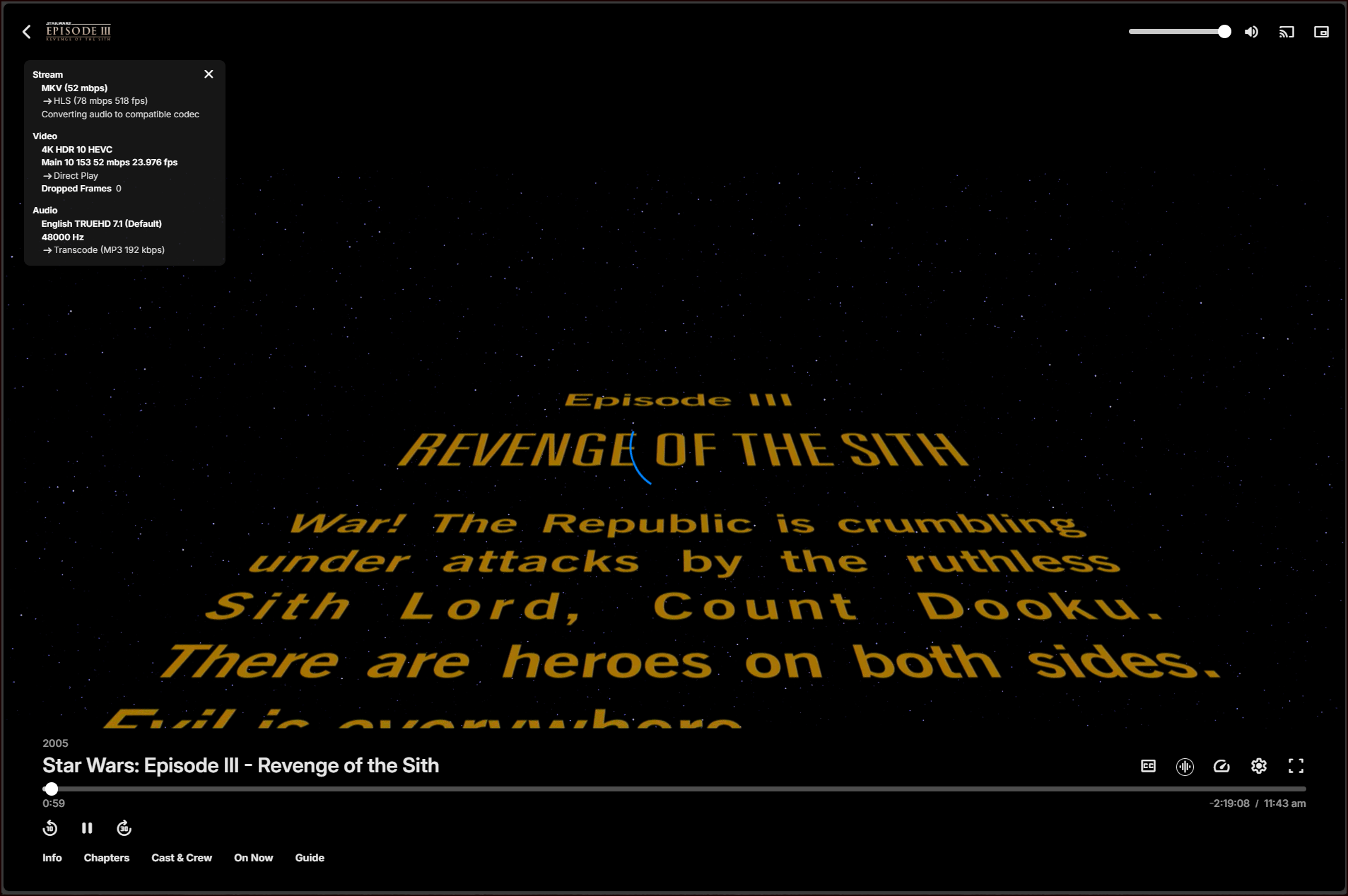 Vidmo232 2 Posted November 23, 2025 Author Posted November 23, 2025 15 minutes ago, Happy2Play said: Most likely a browser issue itself as the browser player is really out of Emby's control. Is it all content or specific content? Is it only remux content? If video and audio Direct play do you see the same results? I've only got a dozen HEVC movies that I own, so its not a good sample size unfortunately. The issue occurs with every HEVC Star Wars title at the exact same time (0:59) into the movie. Top Gun: Maverick seems to be ok and it uses DirectPlay for video and transcodes the audio to MP3 just like the Star Wars movies. BUT right around the 1 minute mark it does stall for a brief second and drops a frame but then continues on from there. It seems like the titles with TrueHD 7.1 as the audio source are more problematic. Maybe I'll remove that audio channel from a test title and see if that has an effect.