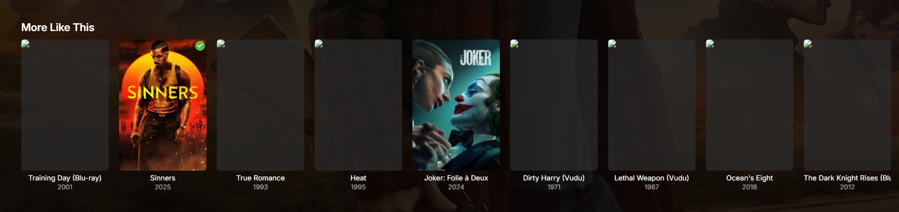 Thunder3dan 1 Posted November 25, 2025 Posted November 25, 2025 (edited) A few of my movies are missing movie posters in the "more like this" section. It only seems to impact a few movies. I have removed them and re-identified them but this issue still persists. Updated meta data but they are still missing. Below is example of what I'm seeing. If I click on the movie in the more like this section it shows the movie poster. So the movie posters are there. I haven't changed anything with my setup. I use the apple tv app for watching movies and this issue doesn't seem to occur within the apple tv app. Only when viewing via windows. Edited November 25, 2025 by Thunder3dan added more information