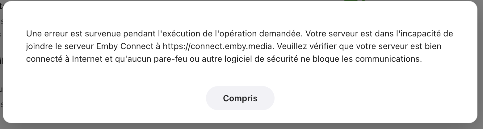 vincen 71 Posted December 1, 2025 Posted December 1, 2025 Salut Oui comme l'indique le message ton serveur Emby n'arrive pas à se connecter à Internet et au site web d'Emby ! Des modifications de configuration de ton réseau ? un firewall actif sur ton routeur internet et/ou la machine qui héberge ton serveur Emby ? Vincèn