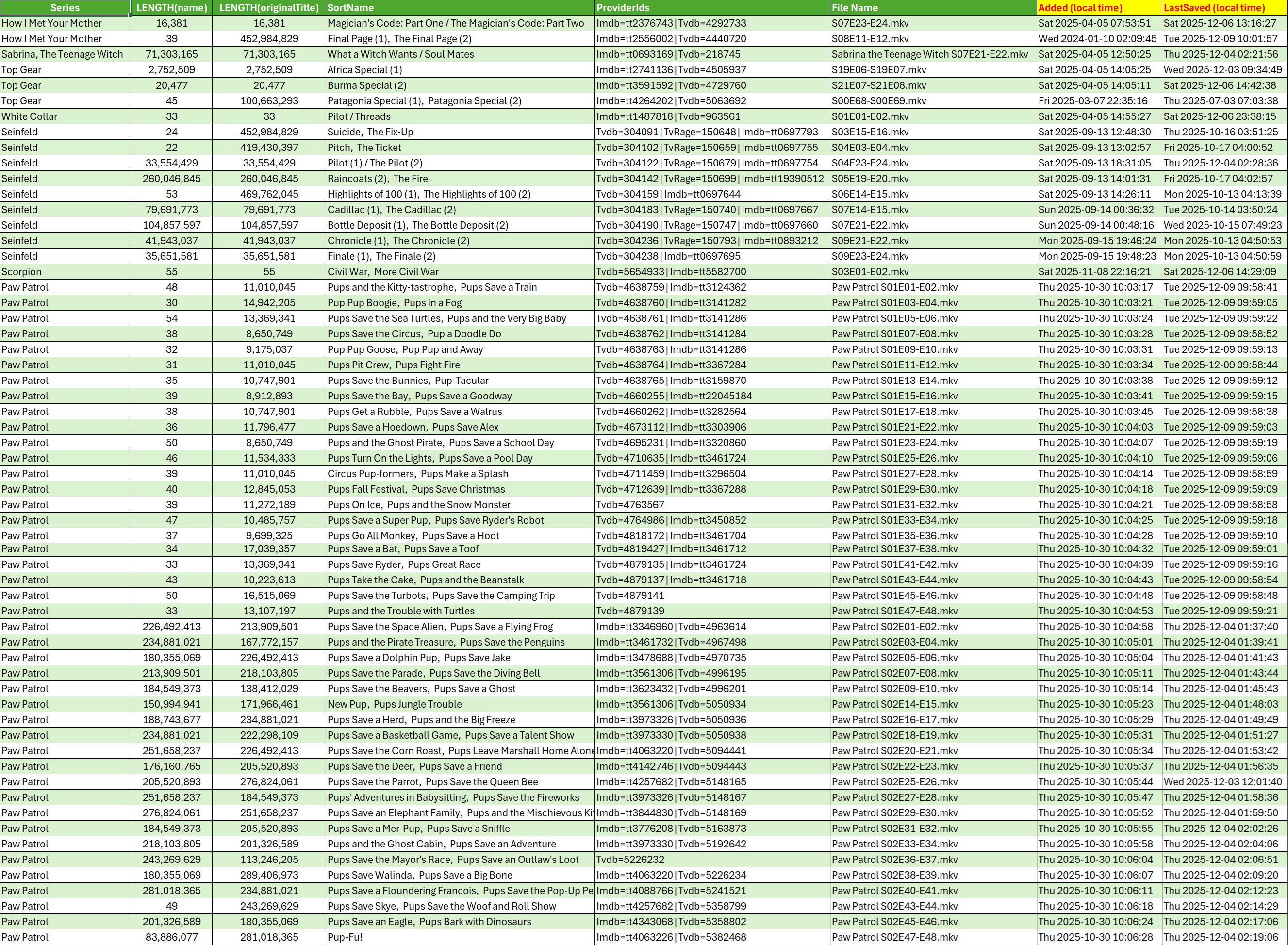 sa2000 674 Posted December 10, 2025 Posted December 10, 2025 Thanks for the database and the updated nfo for Paw Patrol S01E39-E40 There are inconsistencies in the data in the nfo which appear to relate to thetvdb changes to introduce "US Airing Order". So at some point the metadata had the episode titles based on the "US Airing Order" rather than the default "Aired Order". Whilst the title and original title are now based on the Aired Order, the sortname field still has the US Airing Order title. Not sure what we update on refreshes and it is possible some fields are not. thetvdb has these titles for the different airing date orders AirDate Order: E39 - Pups and the Beanstalk E40 - Pups save the turbots US Airing Date order: E39 - Pups Save the Easter Egg Hunt E40 - Pups and The Lighthouse Boogie Your nfo has the following now E39 <title>Pups Save the Easter Egg Hunt</title> <originaltitle>Pups and the Beanstalk / Pups Save the Turbots </originaltitle> <sorttitle>Pups Save the Easter Egg Hunt, Pups and the Lighthouse Boogie</sorttitle> <imdbid>tt3461700</imdbid> <tvdbid>4856019</tvdbid> <uniqueid type="tvdb">4856019</uniqueid> <uniqueid type="imdb">tt3461700</uniqueid> <episode>39</episode> <season>1</season> <aired>2014-04-13</aired> E40 <title>Pups and the Lighthouse Boogie</title> <originaltitle>Pups and the Beanstalk / Pups Save the Turbots </originaltitle> <sorttitle>Pups Save the Easter Egg Hunt, Pups and the Lighthouse Boogie</sorttitle> <episode>40</episode> <season>1</season> <aired>2014-04-13</aired> Maybe the safest option is to move the files out of the current library paths, scan the library and then bring the files back I thought maybe the issue / cause is to do with switching back and forth between "US Airing Order" and "Aired Order" but looking at the other media files with issues - the "How I Met Your Mother" series does not have a different aired order - so that blows that idea. Looking at your database, the following are shows and seasons that need to be corrected I have not been able to see a pattern to allow me to try and reproduce. The issue appears to be mostly with the originaltitle field. All my attempts so far have not reproduced the issue. This gives you the multi-episode files that have the issue in addition to Paw Patrol E39-E40 Looking at this list, do you know what might have been common to cause the problem? 1