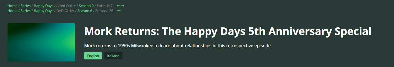 tesla1886 3 Posted December 7, 2025 Author Posted December 7, 2025 On 12/6/2025 at 10:35 AM, Luke said: HI there, can you please provide a specific example? How to Report a Problem Thanks ! When making this post, I found it seems to be slightly more complicated than I thought. Happy Days has an episode called 'Mork Returns" It is episode 24 of season 6. It is not listed in Emby, however clicking the episode "The Duel" plays "Mork Returns', clicking "Chachi's Incredo-Wax" plays "The Duel" and clicking "Potsie Quits School" Plays ""Chachi's Incredo-Wax". It is not currently possible play the episode "Potsie Quits School" from Emby, despite it being listed in Emby. Although "Potsie Quits School" is listed, it is not currently possible to play it. So, perhaps more easily understandably "Mork Returns" not listed "The Duel" --> "Mork Returns" "Chachi's Incredo-Wax" --> "The Duel" "Potsie Quits School" --> "Chachi's Incredo-Wax" Can't play "Potsie Quits School" from Emby All of this seems to because Mork Returns is not listed on thetvdb.com