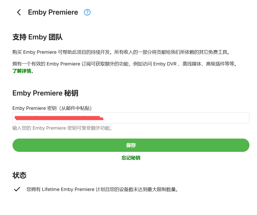 Solution phx-yang 1 Posted December 17, 2025 Author Solution Posted December 17, 2025 3 hours ago, GrimReaper said: 这样应该就足够了,它应该能为你所有客户端启用播放(以及所有其他Premiere功能)——如果你看到了这个: 这很可能和客户本身有关。那些是本地连接还是远程连接?你看到任何控制台错误了吗? OK, the problem has been resolved. I uninstalled Emby, reinstalled the official Synology version, entered the premiere key again, and then it was successfully activated... 1