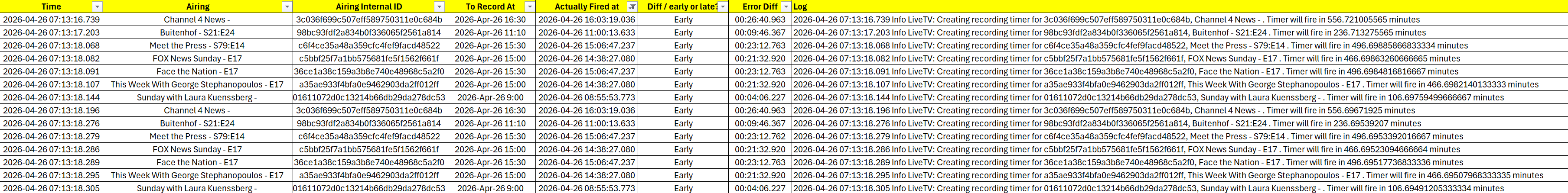 sa2000 722 Posted 2 hours ago Posted 2 hours ago 12 minutes ago, sa2000 said: you please give me other examples that went wrong between 20:38 25th April and 19:53 26th April for a channel that is in the GBR-1000197-DEFAULT lineup OK - I can see it 2026-04-26 07:13:16.739 Info LiveTV: Creating recording timer for 3c036f699c507eff589750311e0c684b, Channel 4 News - . Timer will fire in 556.721005565 minutes should fire in 9 hours 16 minutes 43 seconds - should fire at 16:30 2026-04-26 16:03:19.036 Info LiveTV: Recording timer fired for 3c036f699c507eff589750311e0c684b Channel 4 News - . So this fired about 27 minutes early Could this be a WSL quirk?