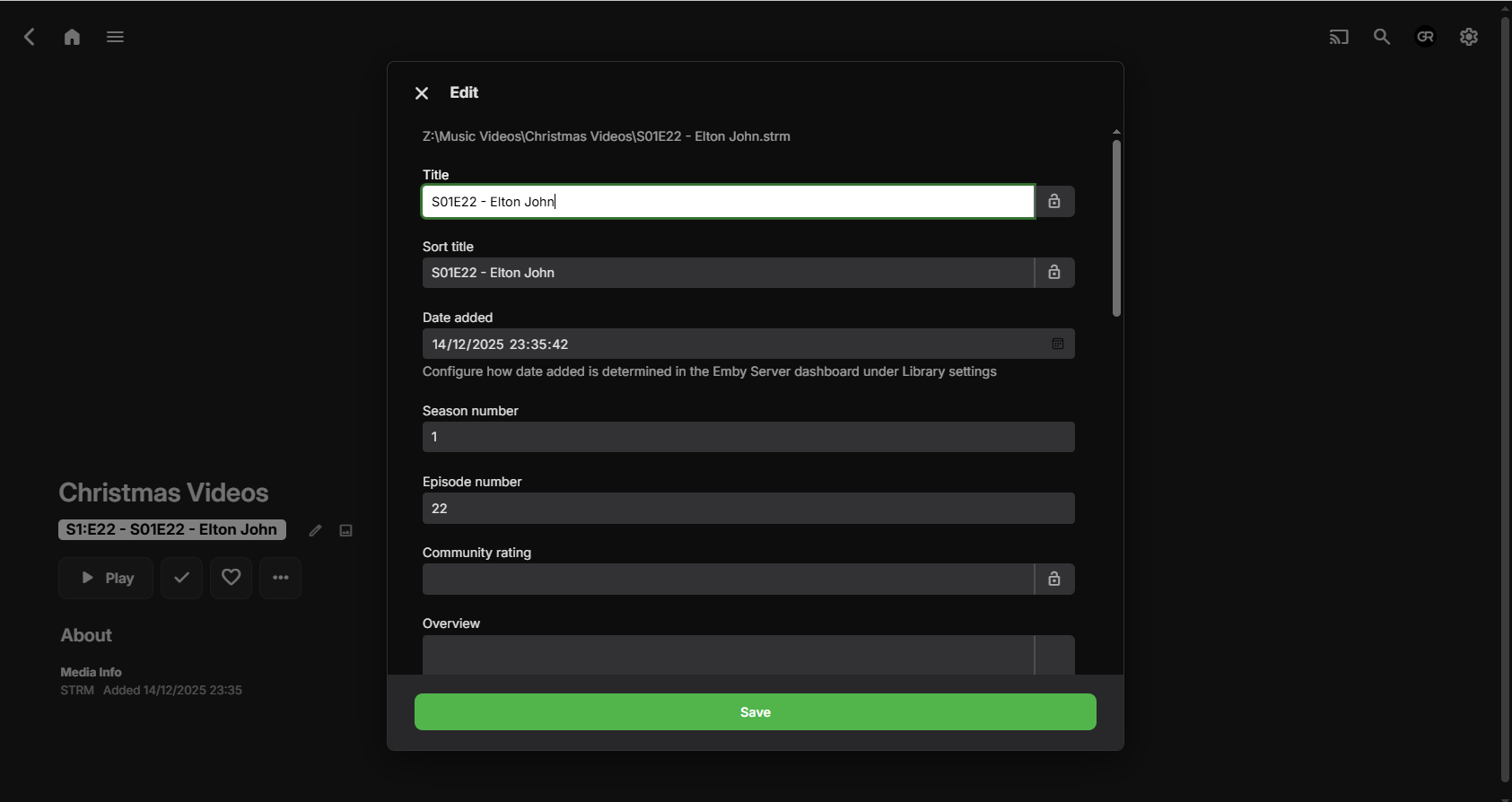 Daniel1966 6 Posted December 14, 2025 Posted December 14, 2025 (edited) . I have content that is named in the proper way for TV episodes: S01E01 - Title 1.mp4 S01E02 - Title 2 [1080p].mkv S01E03 - Title 3.mp4 etc..... These are not anything that would be found in IMDB or any other database. It's a folder of Music Videos that I created and named as if it was a TV show. But the metadata field for Season and Episode Number are blank. Metadata is not locked. Shouldn't it read the Season and Episode number from the properly-named Filename? . I have run a library scan many times and these fields never get filled in. Without these numbers, the episodes do not list in the correct order. Am I missing something? . . Also, Note that on the main page, it shows 12 videos, but there are actually 60 videos in this folder. And if you go into the folder, all 60 videos are there, but just wondering why it says 12 on the Season. Any ideas? They are all MKV and MP4 files. . I am on Windows 11, latest server. (I have had issues in the past with someone getting angry over my ability to identify what kind of server I am using. I don't know how to say it any differently or better. It's Windows 11. I use Chrome. I have the standard version [not Premiere]). I would really appreciate only getting a response if you can be polite and helpful. . . Edited December 14, 2025 by Daniel1966 spelling
