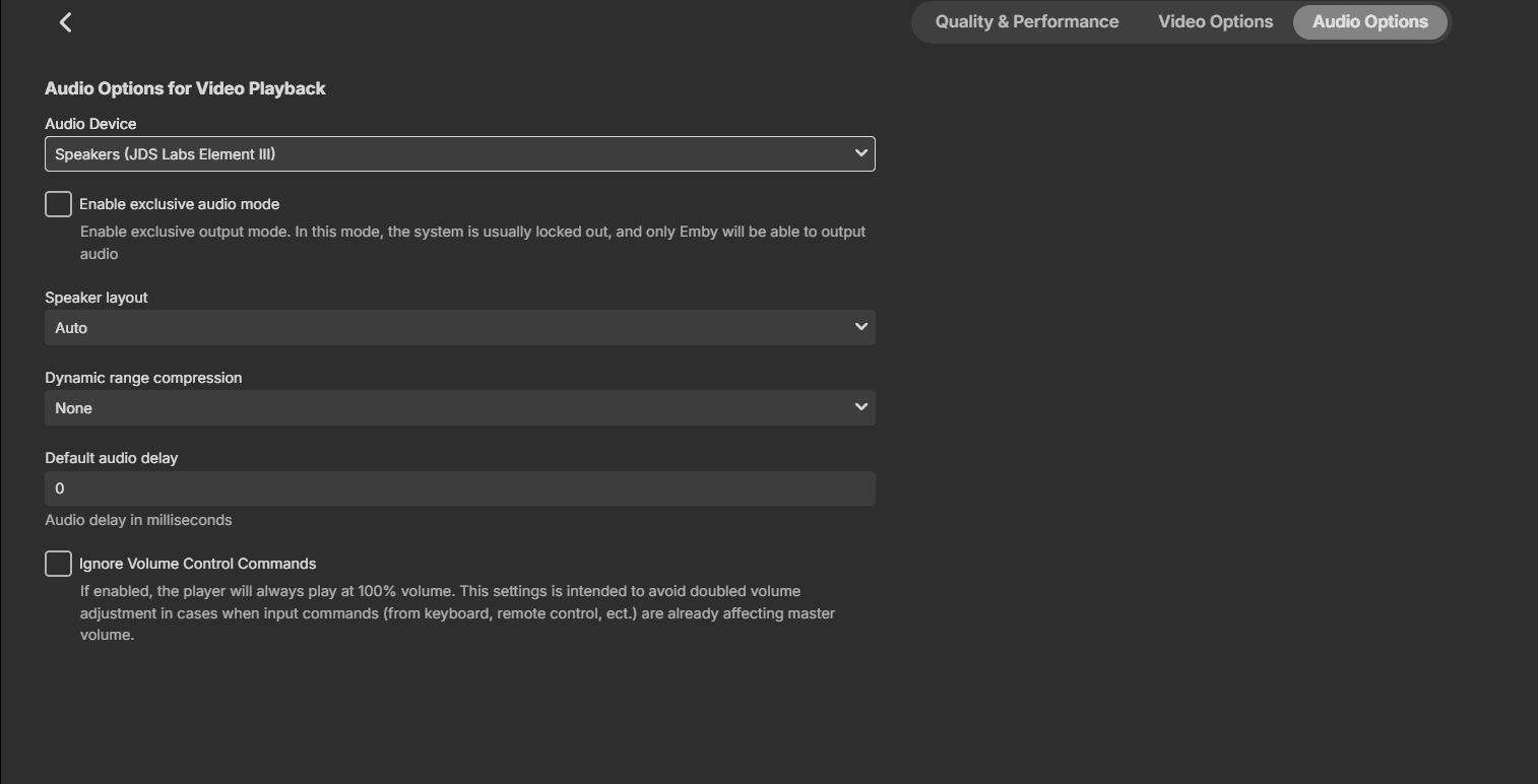 bandit8623 213 Posted December 19, 2025 Author Posted December 19, 2025 (edited) 4 hours ago, softworkz said: There are a number of places where volume can be controlled: Inside MPV player Windows per-App sound mixer Windows global volume Sometimes, audio devices have their own additional software control for volume Hardware volume (in case of speakers) and additional knobs that are possibly affecting volume: Speaker layout mismatch (try set explicitly Windows speaker layout setup (right-click device in Windows settings and select "Set up speakers" Dynamic range compression enabled So, please go through all of these and check. Two things for reducing confusion and number of places involved: Enable "Exclusive audio mode" Enable "Ignore volume control commands ill try exclusive mode. i have a usb dac that the settings dont change when using browser vs app. the audio only seems off for ac3 audio on live tv. ill double check this Edited December 19, 2025 by bandit8623