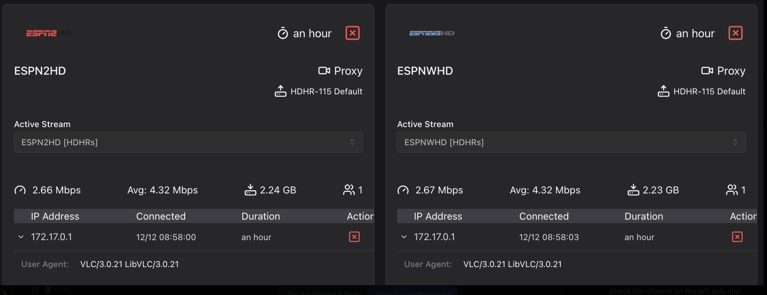 knoll126 10 Posted December 16, 2025 Posted December 16, 2025 (edited) Hi, I have had this issue a handful of times now and am looking for help. I am using Dispatcharr as a "middle man" to get feeds into Emby. I am using HDHR Primes as my tuners. I have noticed that last few days that I have streams that have been active for over 12 hours according to Dispatcharr. This current one was from our ABC channel starting on 12/15, and the prior ones that I took a screenshot of was from 12/12 (not 12 hours in this case, but still the same problem). As soon as I restart my Emby server, my HDHR tuner gets freed up of the streams and Dispatcharr then displays not active streams. At no point do I see any active connection in the Emby server dashboard. I have attached logs, but unsure if those are the correct ones. embyserver-63901440000.txt embyserver.txt embyserver-63901467151.txt Edited December 16, 2025 by knoll126