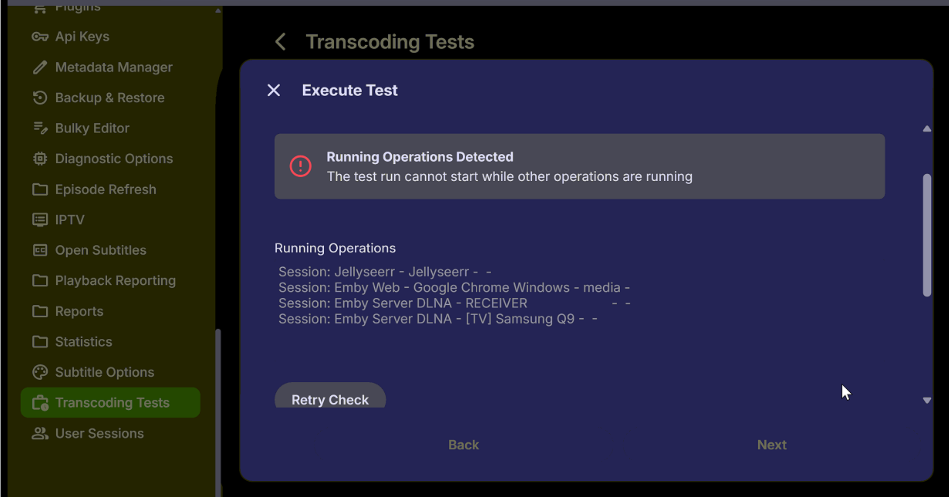 noybman 9 Posted December 25, 2025 Author Posted December 25, 2025 Yes... I did create a new, much more simple basic session jsut now, and it has the same issues. The issue being, I cannot run a transcoding test, because Emby thinks it's busy doing something else, and it appears to be considering my very login via chrome to manage the server a sesson......