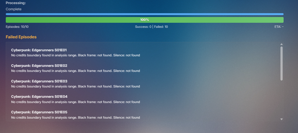 yocker 1247 Posted January 31 Author Posted January 31 1 minute ago, Rykalout said: I tested it on Breaking Bad, Chernobyl, Euphoria, and it does the same thing, no matter what I put it on. credits-detection-debug-2026-01-31T14-44-59.log 47.66 kB · 0 downloads credits-detection-debug-2026-01-31T14-44-33.log 18.05 kB · 0 downloads credits-detection-debug-2026-01-31T14-44-21.log 168.24 kB · 0 downloads Thank you. Almost looks like it can't find your ffmpeg.