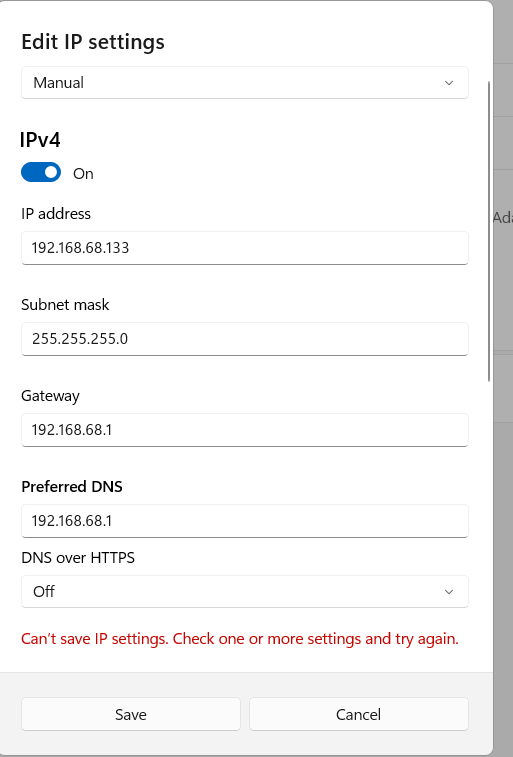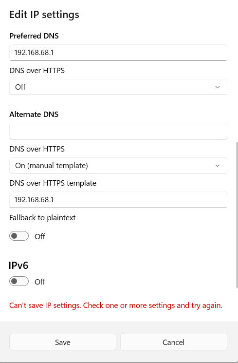 Lessaj 467 Posted December 29, 2025 Posted December 29, 2025 Set the alternate DNS -> DNS over HTTPS to off and that should let you save it. I've never edited IPs from here before, only the old school way from Network Connections -> Properties -> IPv4 Properties.