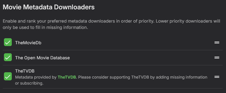 Alcyone7 6 Posted December 29, 2025 Author Posted December 29, 2025 The fetch order is: TheMovieDB The Open Movie Database TheTVDB