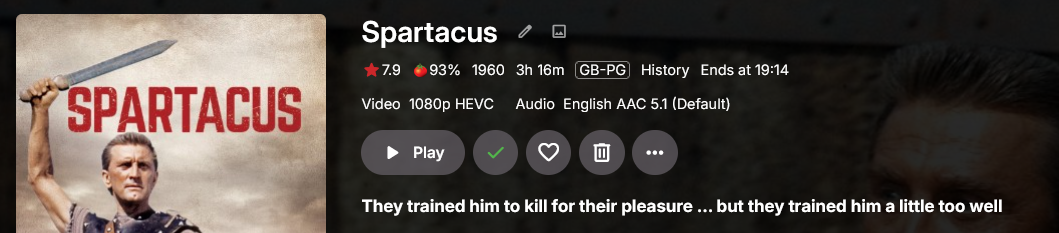 Alcyone7 6 Posted December 29, 2025 Author Posted December 29, 2025 1 minute ago, Happy2Play said: Well I see on issue as this MiniSeries is not a Movie and I fetched it and go none of what you see in a TV library. Spartacus (TV Series 2004-2004) — The Movie Database (TMDB) Will retest in Movie library but expect it to fail unless info comes from alternate provider and a wild guess would OMDB so I will check their api now. Showing your age. It was a film, long before it was a series.