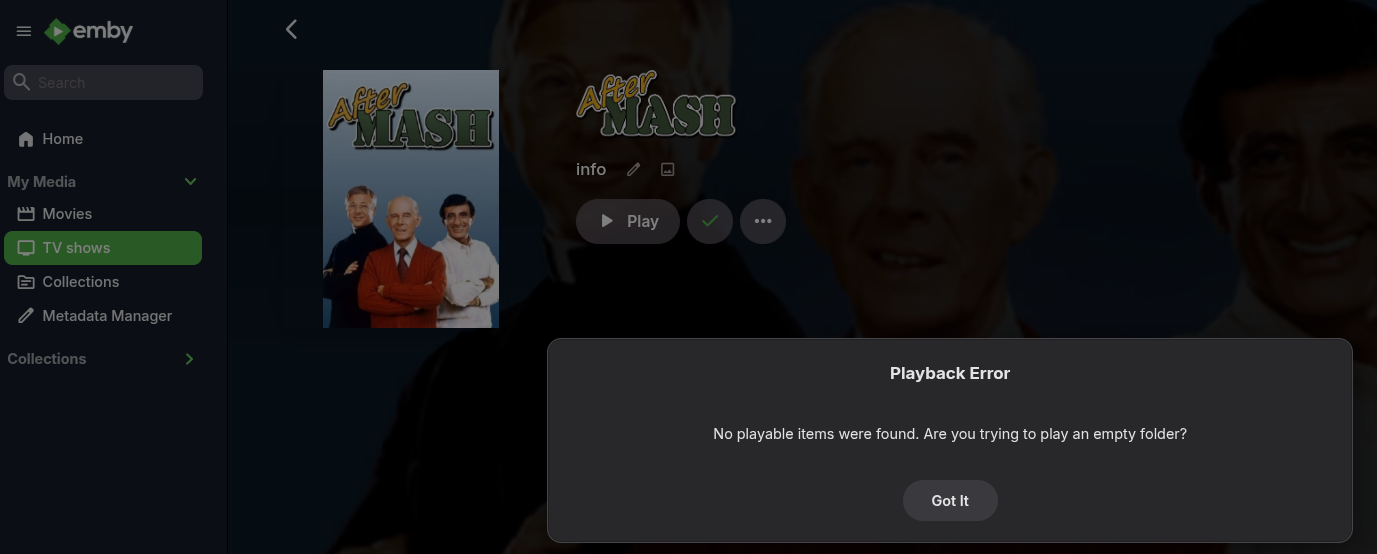rwyarbrough 8 Posted December 30, 2025 Author Posted December 30, 2025 My info directory contents: info ├── .ignore ├── .nomedia └── After MASH Episode List.txt My attempts: 1st attempt .embyignore file location: /diskmounts/datastore/multimedia-08/video_library/tv_shows 1st attempt .embyignore file contents: classics-1980-1989/AfterMASH/info/* 2nd attempt .embyignore file location: /diskmounts/datastore/multimedia-08/video_library/tv_shows/classics-1980-1989 2nd attempt .embyignore file contents: AfterMASH/info/* What emby displays both attempts...