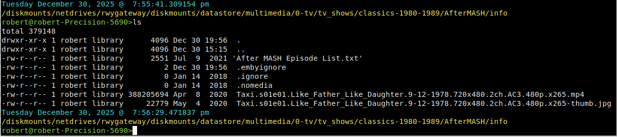 rwyarbrough 8 Posted December 31, 2025 Author Posted December 31, 2025 (edited) 11 hours ago, Boulvejak said: I am now spending hours of evening after work cleaning up .nfo and thumbnail files from previously hidden directories in my media library. I found the following works and you don't have to touch every directory, only the root directory of the folder. For example on my TV shows Library I have 29 folders I had to add to emby. This is due to my file organization with my TV shows adding a directory. SO in my TV Library I have 29 folders as follows Since each category directory is the "root" of the emby library folder, I added 29 .embyignore files to get the job done. If you only have 1 folder in you library, then you only need 1 .embyignore to accomplish what the .ignore files did. All 29 .embyignore files are identical to further ease the task. My 29 .embyignore files contains the following: */info */artwork This works great! Edited December 31, 2025 by rwyarbrough