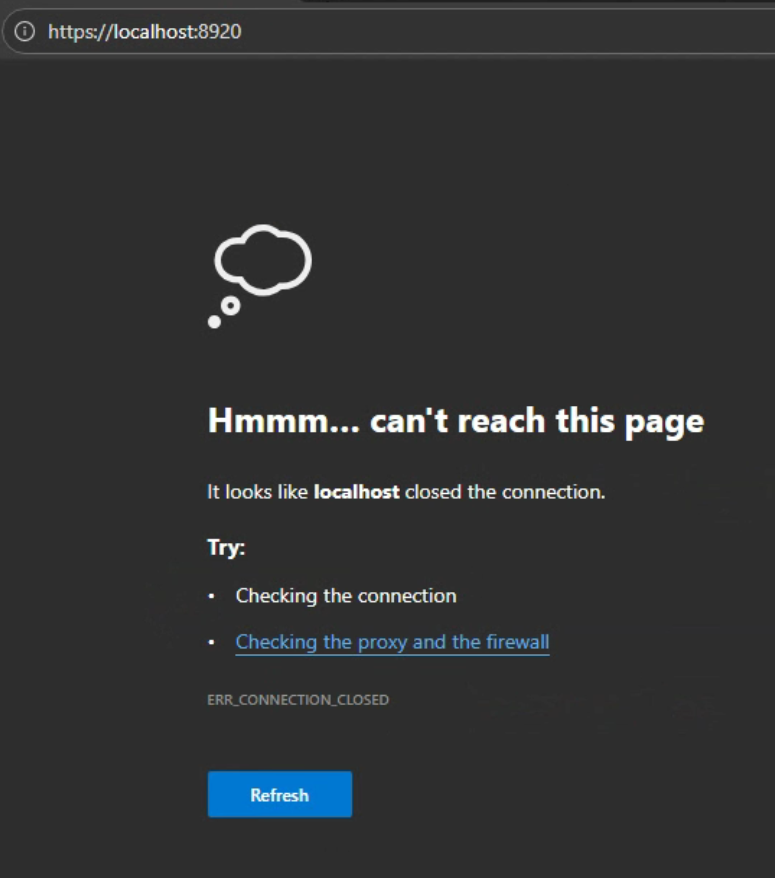 juerg 0 Posted January 15 Author Posted January 15 20 hours ago, Lessaj said: I don't see anything in your logs that would indicate there's anything preventing access to 8920 on localhost, that has nothing to do with your networking equipment it's completely local to the device. If that doesn't work, it'll never work from anywhere else either. What error are you seeing in the web browser when trying to connect to: https://localhost:8920 Hi here are the messages from chrome and edge, the same happens for 192.168.1.160 and 127.0.0.1