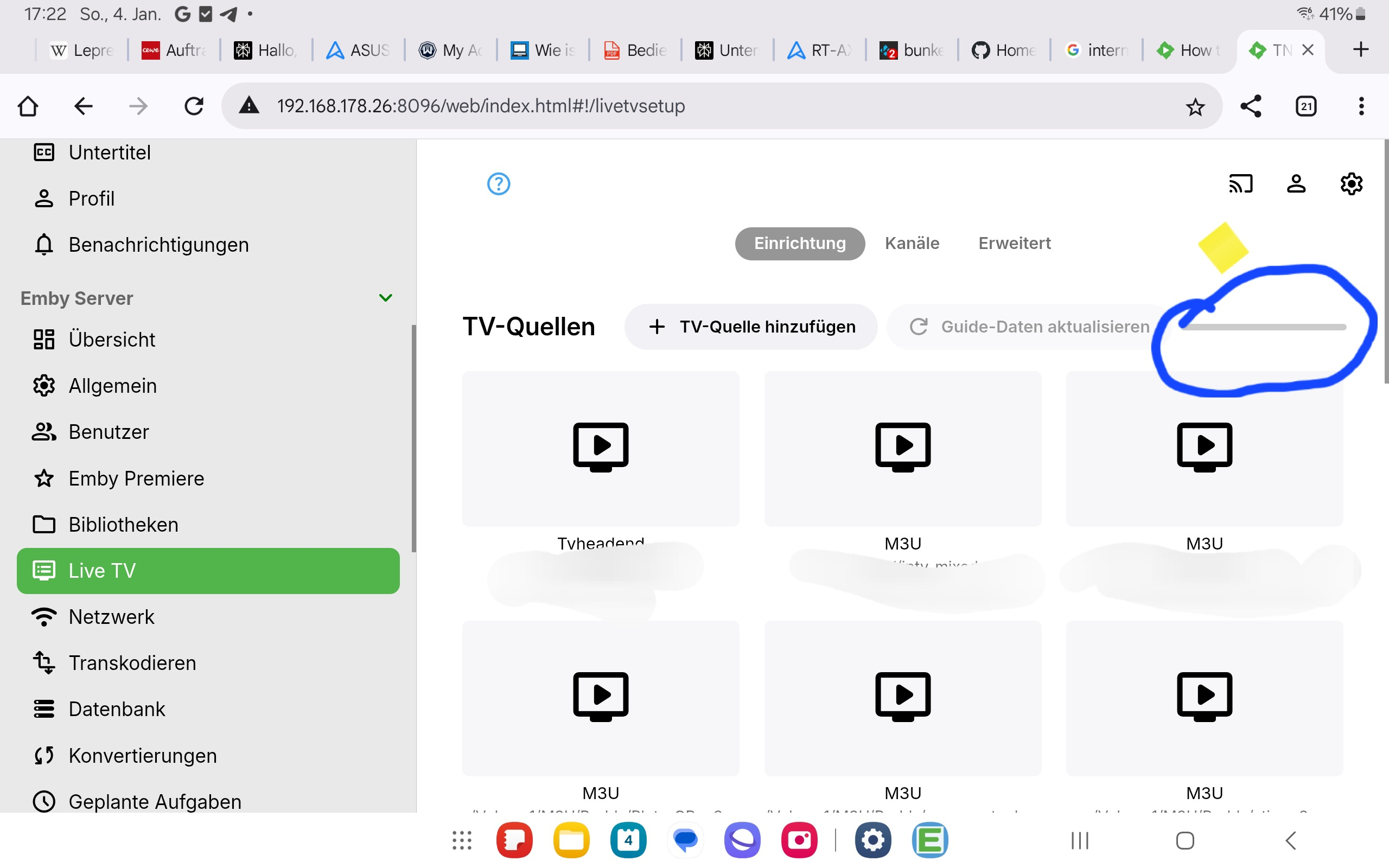 Neminem 1515 Posted January 11 Posted January 11 In your previous log, I see connection refused. [TVHclient] HTSConnectionAsync.open: caught exception : Connection refused 92.206.32.123:99722026-01-07 20:48:20.631 Info PlaystateService-0HNIB0LKOFF0S:00000528: http/1.1 POST http://192.168.178.26:8096/emby/Sessions/Playing/Progress. Source Ip: host12, UserAgent: Dalvik/2.1.0 (Linux; U; Android 12; PYUR TV BOX Build/STT5.250620.001) 2026-01-07 20:48:20.633 Info PlaystateService-0HNIB0LKOFF0S:00000528: http/1.1 Response 204 to host12. Time: 1ms. POST http://192.168.178.26:8096/emby/Sessions/Playing/Progress.