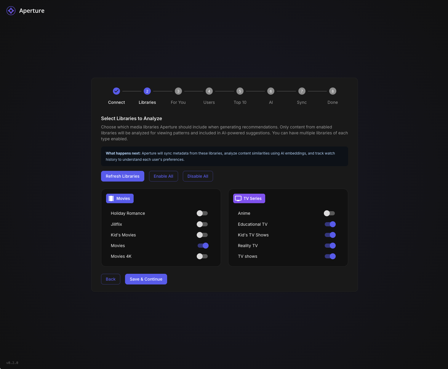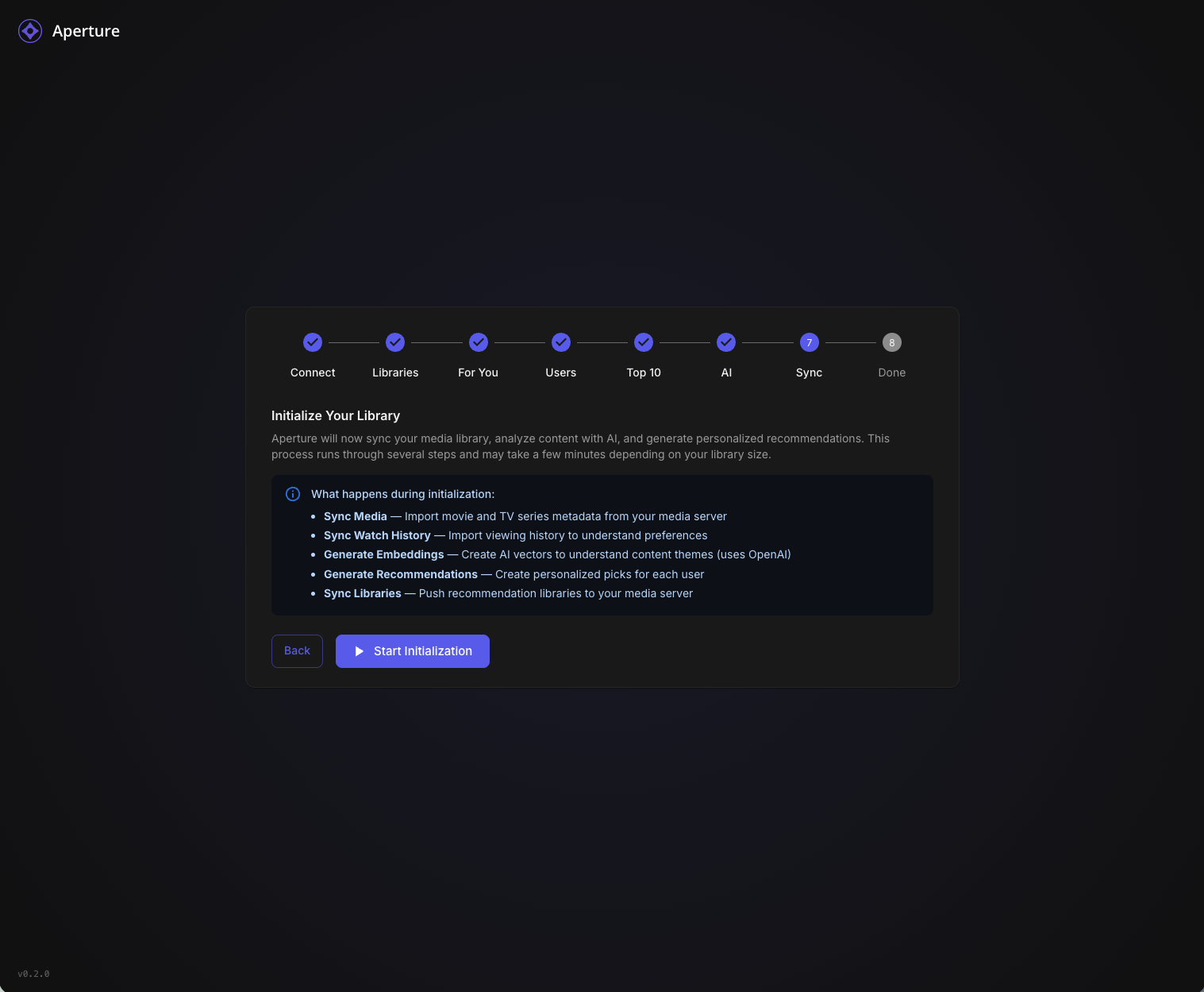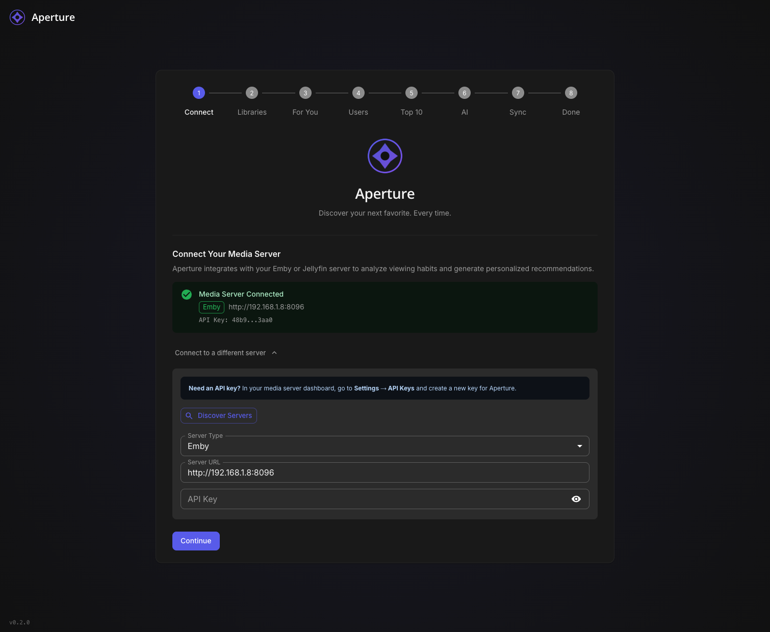 TheGru 143 Posted January 10 Author Posted January 10 Aperture v0.2.0 - New Setup Wizard & Fresh Start Recommended TL;DR: Version 0.2.0 introduces a completely redesigned Setup Wizard that makes first-time configuration a breeze. If you're not too deep into your current setup, we recommend starting fresh. What's New in 0.2.0 Brand New Setup Wizard The biggest addition in this release is a guided, step-by-step setup experience that walks you through everything: Connect - Auto-discover your Emby/Jellyfin server on your network, or enter details manually Libraries - Select which libraries to scan (Aperture-created libraries are now hidden automatically) For You - Configure your personalized "AI Picks" recommendation libraries with custom cover images Users - Enable users for AI recommendations (admins are auto-enabled) Top 10 - Set up global popularity-based picks for your household AI - Connect your OpenAI API key with clear step-by-step instructions Sync - Run initial sync jobs with live progress tracking and detailed logs Done - You're ready to discover your next favorite! Other Improvements Resumable Setup - If you close the wizard, it picks up where you left off Admin Re-run - Access the wizard anytime from Admin Settings to reconfigure Better Library Filtering - Aperture-managed libraries (AI Picks, Top Picks) are automatically hidden from selection Live Job Progress - Watch sync jobs run in real-time with item counts and a live log viewer Default Library Images - Beautiful default cover art for your AI recommendation libraries Fresh Start Recommended If you're early in your Aperture journey and haven't invested significant time configuring things, we recommend starting fresh with this release. The new wizard handles everything the old manual process did, but better. How to Start Over Option 1: Docker Compose (Recommended) # Stop everything docker compose down # Remove the database volume (THIS DELETES ALL DATA) docker volume rm aperture_postgres_data # Pull the latest images docker compose pull # Start fresh docker compose up -d Option 2: Keep Database, Reset Setup If you want to keep your synced media data but re-run the wizard: -- Connect to your database and run: DELETE FROM setup_progress; UPDATE system_settings SET setup_complete = false WHERE id = 1; Then navigate to your Aperture URL and the wizard will appear. Upgrade Notes The setup wizard is only shown when setup hasn't been completed Existing users with completed setups will see the normal login page Admins can access the wizard anytime via Admin Settings → Setup → Re-run Setup Wizard Bug Fixes Fixed static file serving issues in Docker deployments Fixed OpenAI client initialization at startup Improved permission handling for Docker bind mounts Better error messages throughout the application Getting the Update Docker Compose: docker compose pull docker compose up -d From Source: git pull pnpm install pnpm build Questions? Drop a comment below if you run into any issues with the new setup wizard. We're here to help! Happy discovering! Aperture v0.2.0 - "Discover your next favorite. Every time." 1