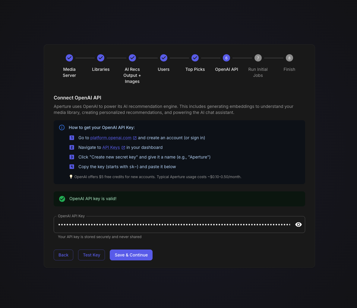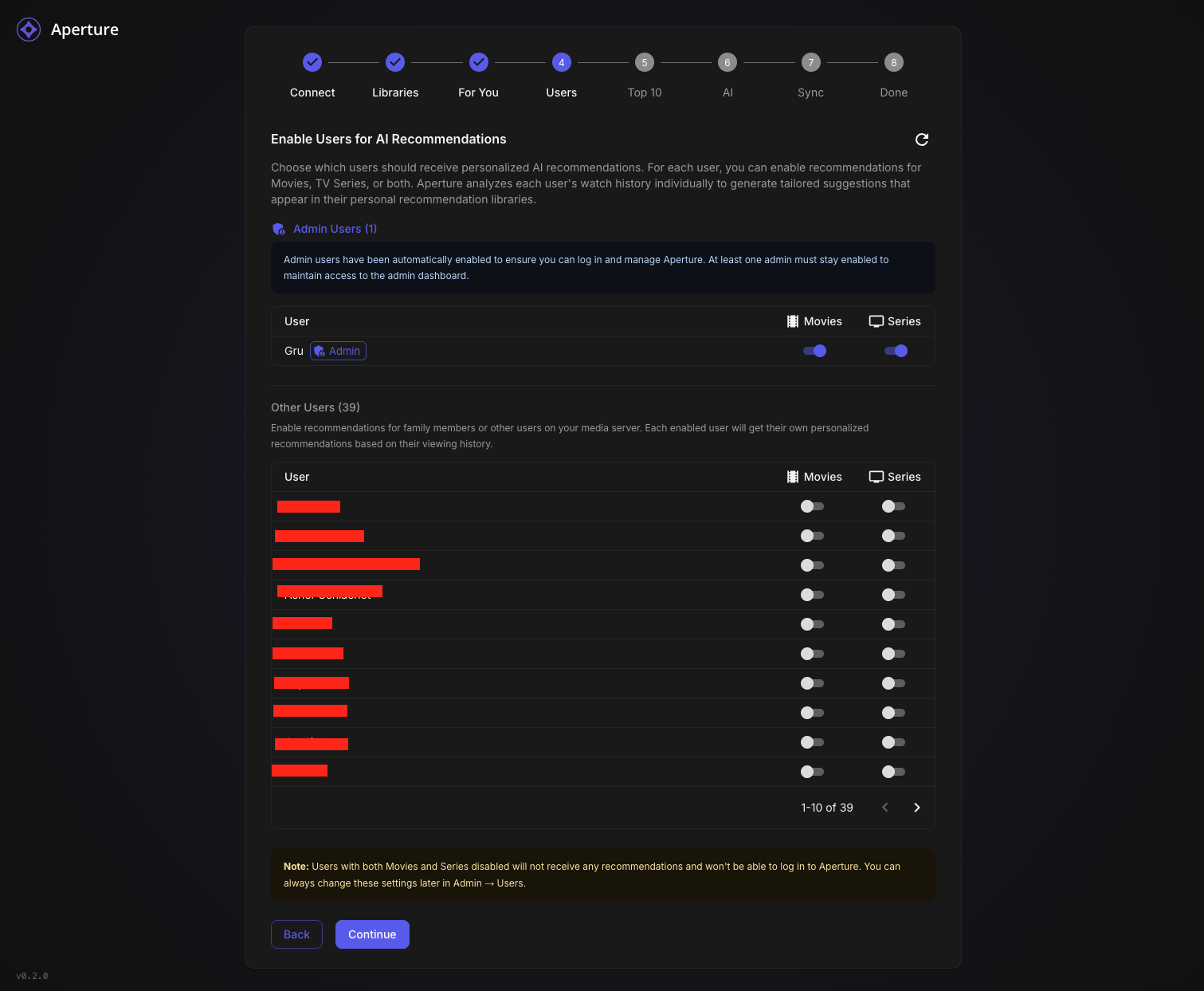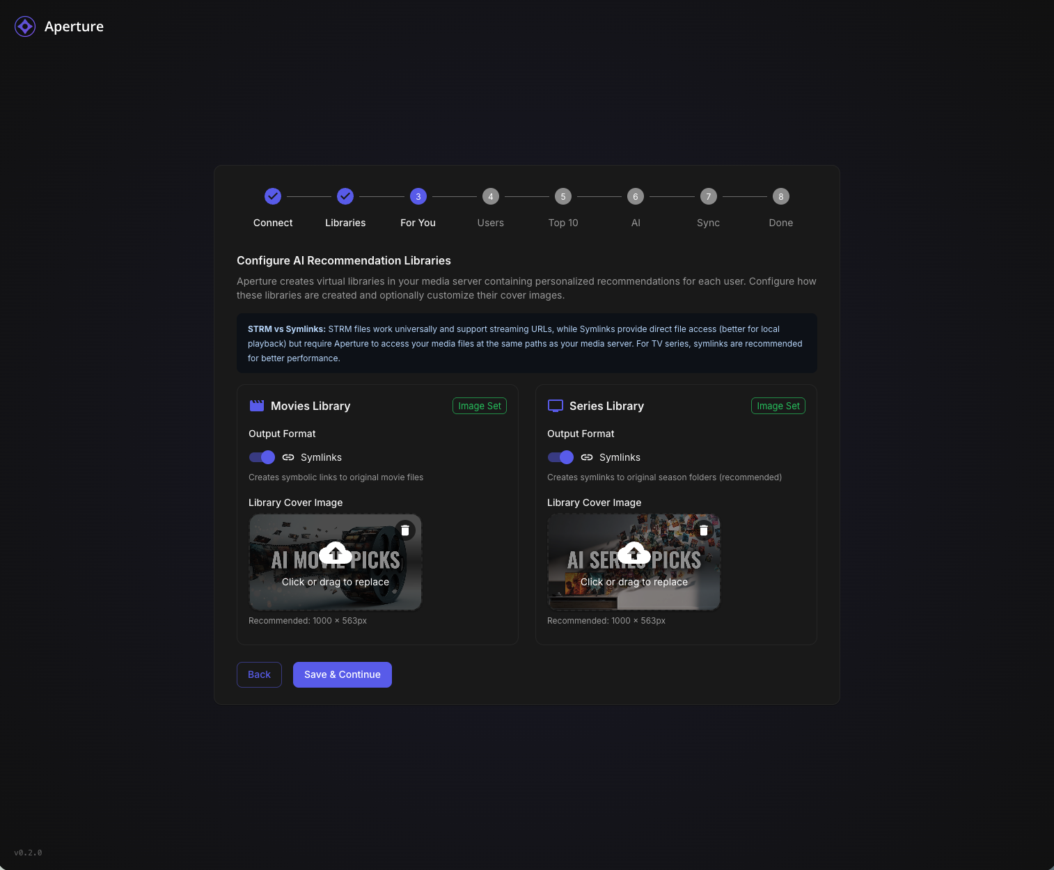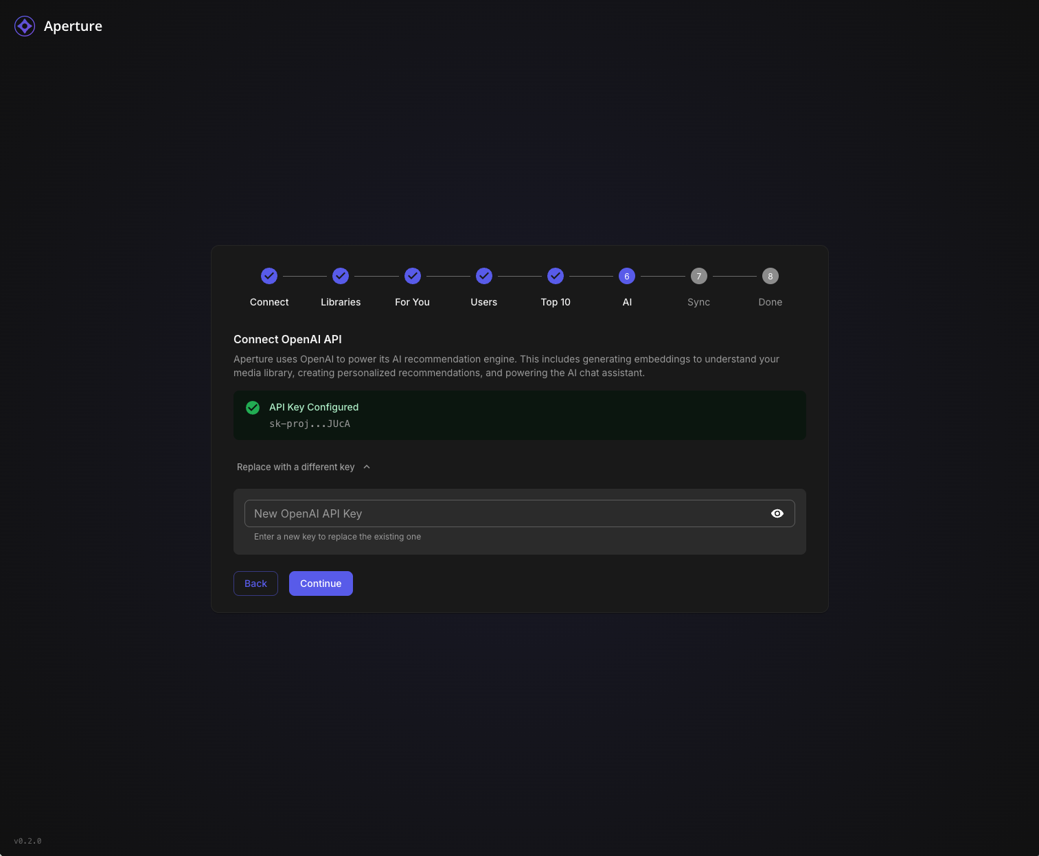 TheGru 143 Posted January 10 Author Posted January 10 Aperture v0.2.0 - New Setup Wizard & Fresh Start Recommended TL;DR: Version 0.2.0 introduces a completely redesigned Setup Wizard that makes first-time configuration a breeze. If you're not too deep into your current setup, we recommend starting fresh. What's New in 0.2.0 Brand New Setup Wizard The biggest addition in this release is a guided, step-by-step setup experience that walks you through everything: Connect - Auto-discover your Emby/Jellyfin server on your network, or enter details manually Libraries - Select which libraries to scan (Aperture-created libraries are now hidden automatically) For You - Configure your personalized "AI Picks" recommendation libraries with custom cover images Users - Enable users for AI recommendations (admins are auto-enabled) Top 10 - Set up global popularity-based picks for your household AI - Connect your OpenAI API key with clear step-by-step instructions Sync - Run initial sync jobs with live progress tracking and detailed logs Done - You're ready to discover your next favorite! Other Improvements Resumable Setup - If you close the wizard, it picks up where you left off Admin Re-run - Access the wizard anytime from Admin Settings to reconfigure Better Library Filtering - Aperture-managed libraries (AI Picks, Top Picks) are automatically hidden from selection Live Job Progress - Watch sync jobs run in real-time with item counts and a live log viewer Default Library Images - Beautiful default cover art for your AI recommendation libraries Fresh Start Recommended If you're early in your Aperture journey and haven't invested significant time configuring things, we recommend starting fresh with this release. The new wizard handles everything the old manual process did, but better. How to Start Over Option 1: Docker Compose (Recommended) # Stop everything docker compose down # Remove the database volume (THIS DELETES ALL DATA) docker volume rm aperture_postgres_data # Pull the latest images docker compose pull # Start fresh docker compose up -d Option 2: Keep Database, Reset Setup If you want to keep your synced media data but re-run the wizard: -- Connect to your database and run: DELETE FROM setup_progress; UPDATE system_settings SET setup_complete = false WHERE id = 1; Then navigate to your Aperture URL and the wizard will appear. Upgrade Notes The setup wizard is only shown when setup hasn't been completed Existing users with completed setups will see the normal login page Admins can access the wizard anytime via Admin Settings → Setup → Re-run Setup Wizard Bug Fixes Fixed static file serving issues in Docker deployments Fixed OpenAI client initialization at startup Improved permission handling for Docker bind mounts Better error messages throughout the application Getting the Update Docker Compose: docker compose pull docker compose up -d From Source: git pull pnpm install pnpm build Questions? Drop a comment below if you run into any issues with the new setup wizard. We're here to help! Happy discovering! Aperture v0.2.0 - "Discover your next favorite. Every time." 1