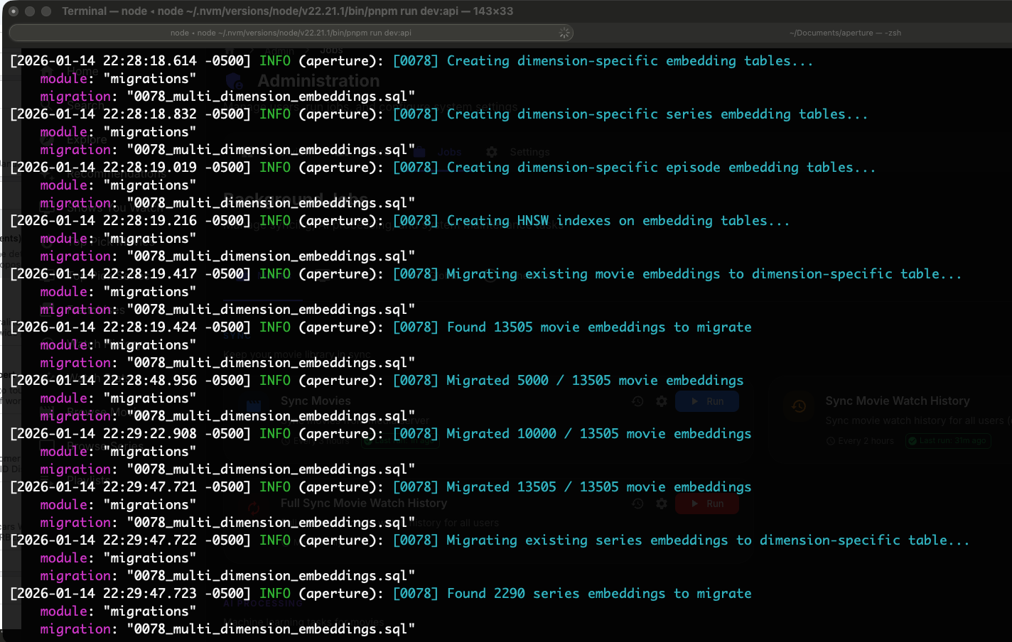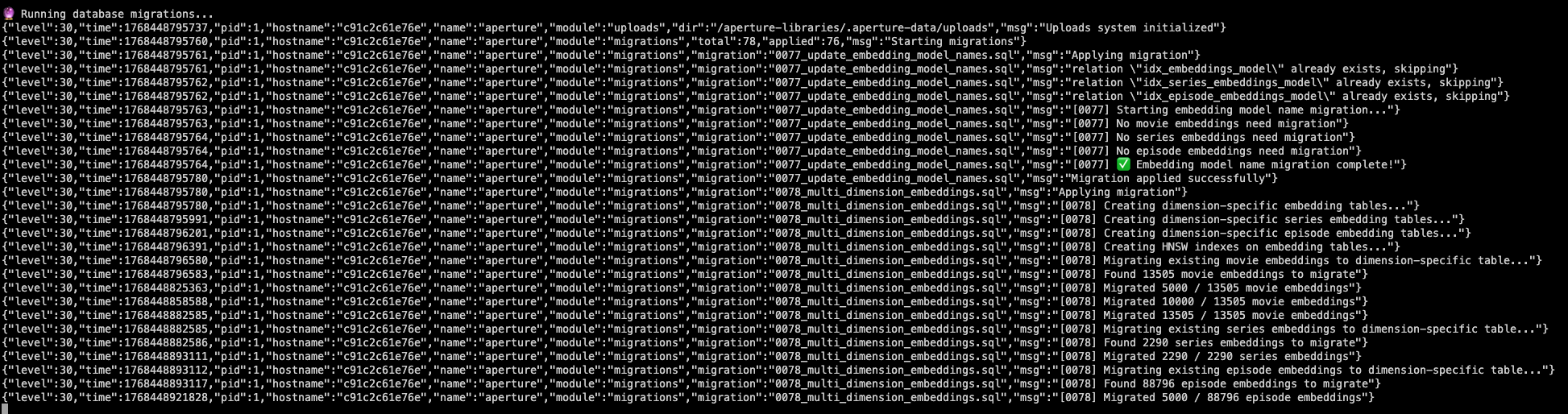 TheGru 143 Posted January 15 Author Posted January 15 (edited) There will be a migration to reorganize existing embeddings... let it run it's not locked up on unraid the above looks like this: Aperture WEB UI will not be available until the migration completes and the API launches, until then you would see a 502 bad gateway error if you try and load the web interface. Edited January 15 by TheGru