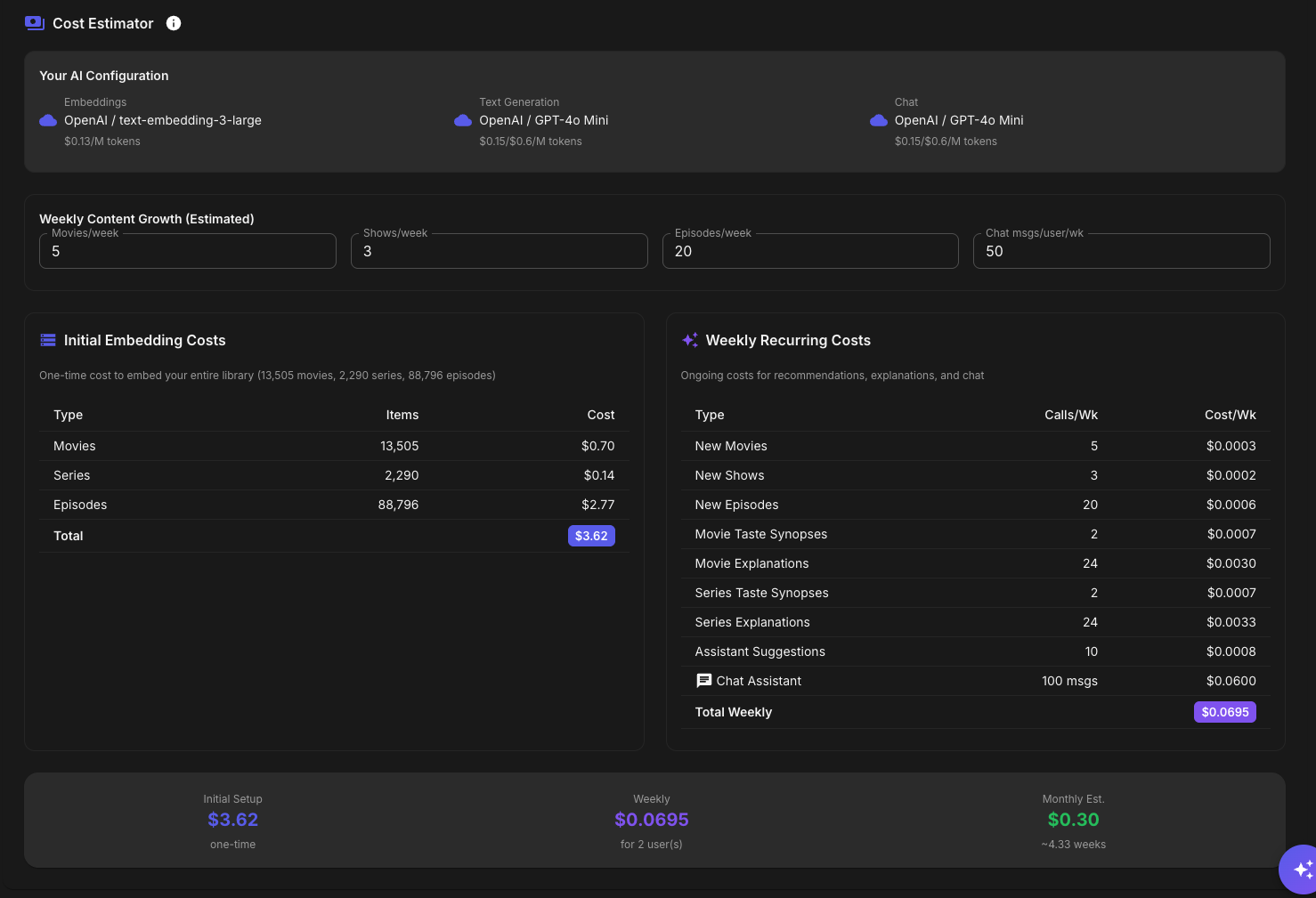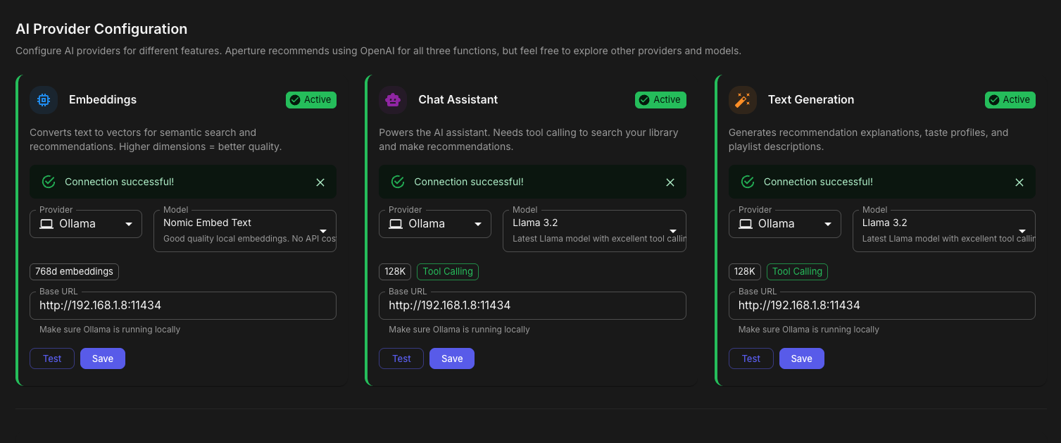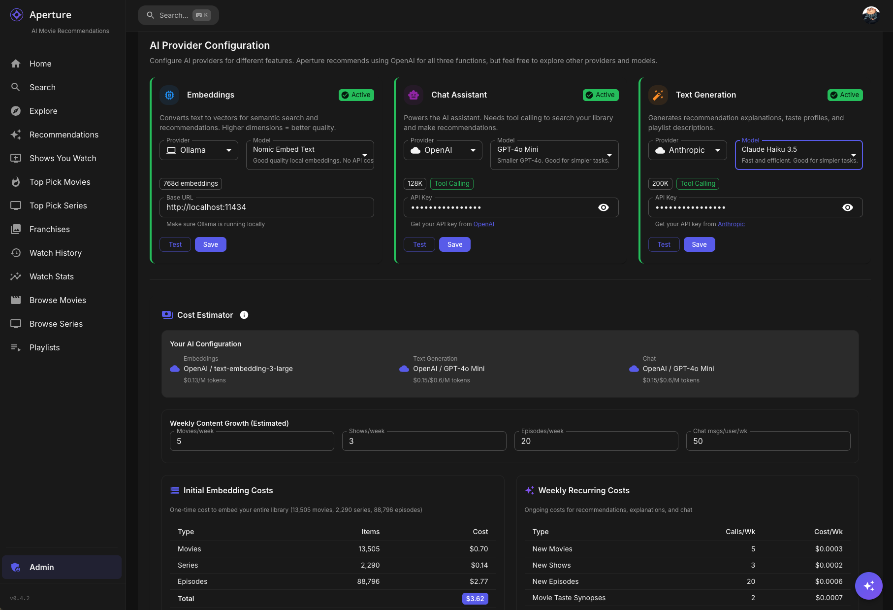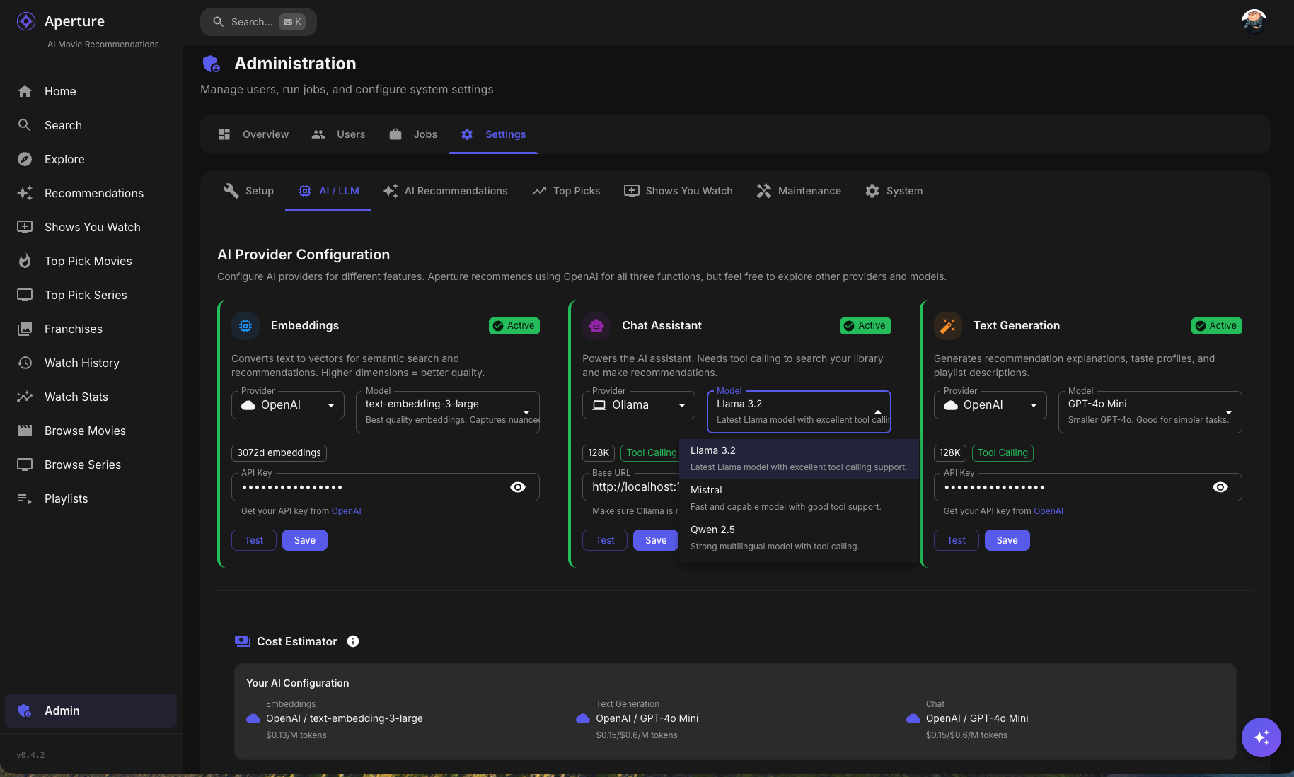 TheGru 143 Posted January 15 Author Posted January 15 Aperture 0.4.2 Beta: Multi-LLM Support is Here! Hey everyone! I'm excited to share a beta release of Aperture 0.4.2 featuring multi-provider AI/LLM support. This has been one of the most requested features, and it's finally ready for testing! What's New? Multi-Provider AI Support You're no longer locked into OpenAI! Aperture now supports: OpenAI (recommended - GPT-4o, GPT-4o-mini, text-embedding-3-large, etc.) Anthropic (Claude 3.5 Sonnet, Claude 3 Haiku, etc.) Google (Gemini 1.5 Pro, Gemini 1.5 Flash) Groq (Llama 3, Mixtral - blazing fast inference) Ollama (run models locally - llama3, mistral, nomic-embed-text) LM Studio (local models with OpenAI-compatible API) Any OpenAI-compatible endpoint Per-Function Configuration The real power here is per-function provider selection. You can now mix and match: Function Use Case Example Setup Embeddings Semantic search, recommendations OpenAI text-embedding-3-large Chat AI Assistant with tool calling Anthropic Claude 3.5 Sonnet Text Generation Explanations, synopses Groq Llama 3 70B (fast & cheap) Want embeddings from OpenAI but chat from Anthropic? Go for it! Dynamic Cost Estimation The new AI / LLM Setup tab includes a cost estimator that: Pulls real-time pricing from providers Estimates costs based on your library size Factors in your content growth rate Shows $0.00 for self-hosted options (Ollama, LM Studio) Other Improvements Setup Wizard Overhaul - Now includes multi-provider configuration Admins can re-run setup - Click "Re-run Setup Wizard" anytime to reconfigure Capability Detection - Warns you if a provider doesn't support features like tool calling Automatic Migration - Existing OpenAI configs are automatically migrated How to Test Pull the beta image: docker pull ghcr.io/dgruhin-hrizn/aperture:llm Or update your docker-compose: services: aperture: image: ghcr.io/dgruhin-hrizn/aperture:llm # ... rest of config Important: This will run a database migration that updates your embedding model names. If you've been using OpenAI embeddings, they'll be migrated to the new format automatically. THIS COULD TAKE A FEW MINUTES, BE PATIENT. Aperture logs will show you progress. Known Issues / Feedback Wanted This is a beta, so please report any issues you find! Particularly interested in: Local LLM users - How's Ollama/LM Studio working for you? Non-OpenAI embeddings - Any quality differences you notice? Cost estimates - Are they accurate for your setup? UI/UX - Is the new AI Setup tab intuitive? Screenshots What's Next? Who knows? Ideas come to me daily, and your feedback is the roadmap. Thanks for testing! Drop your feedback below. Docker Image: ghcr.io/dgruhin-hrizn/aperture:llm Branch: feat-vercel-ai-sdk-multi-llm 3