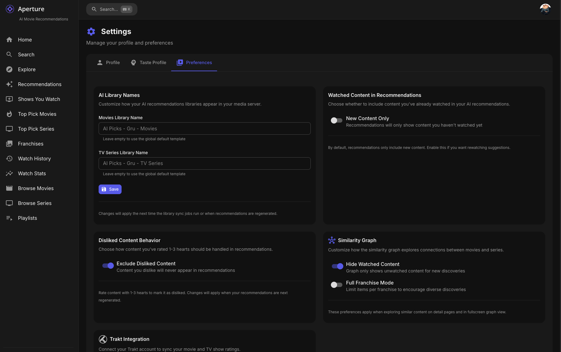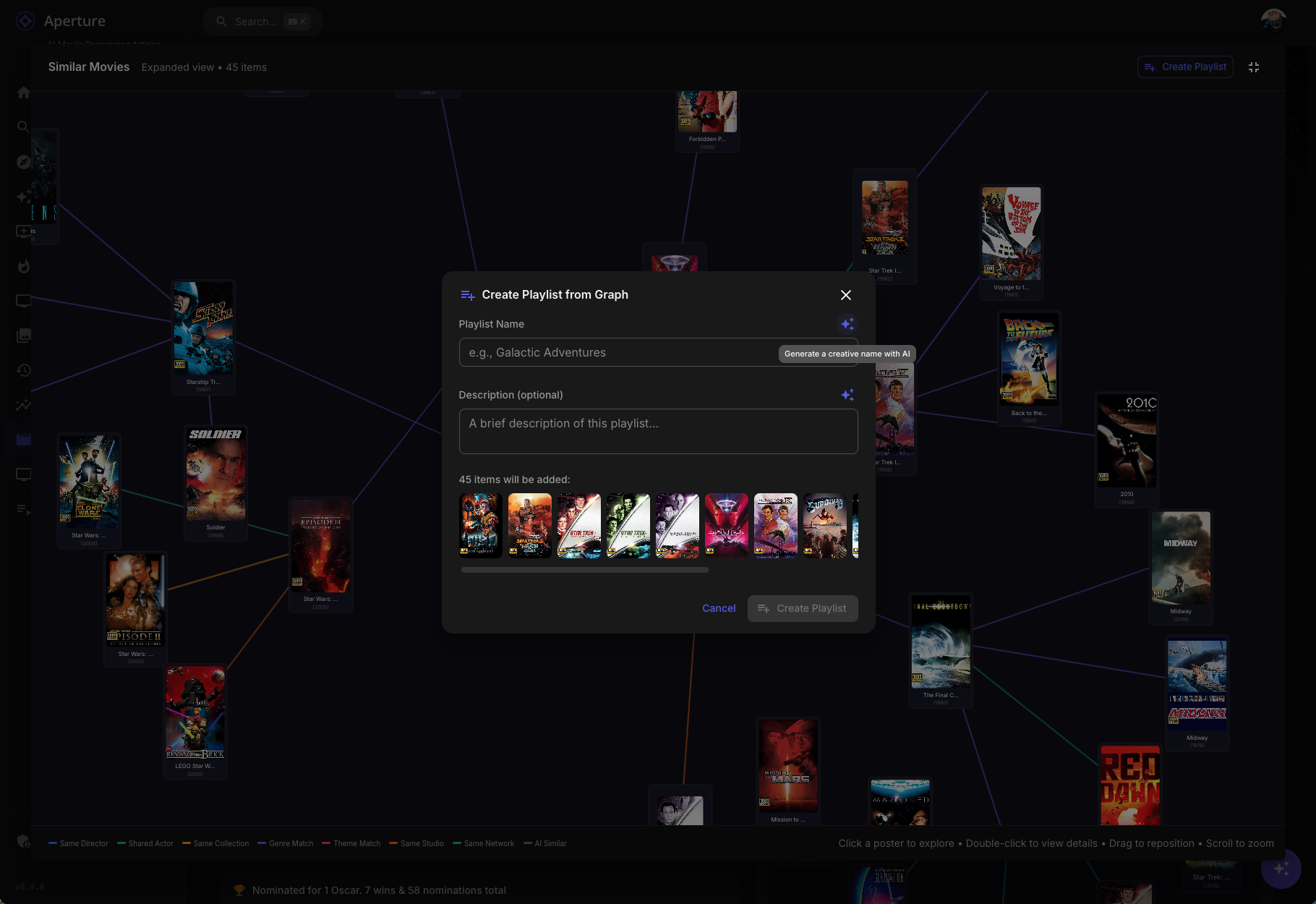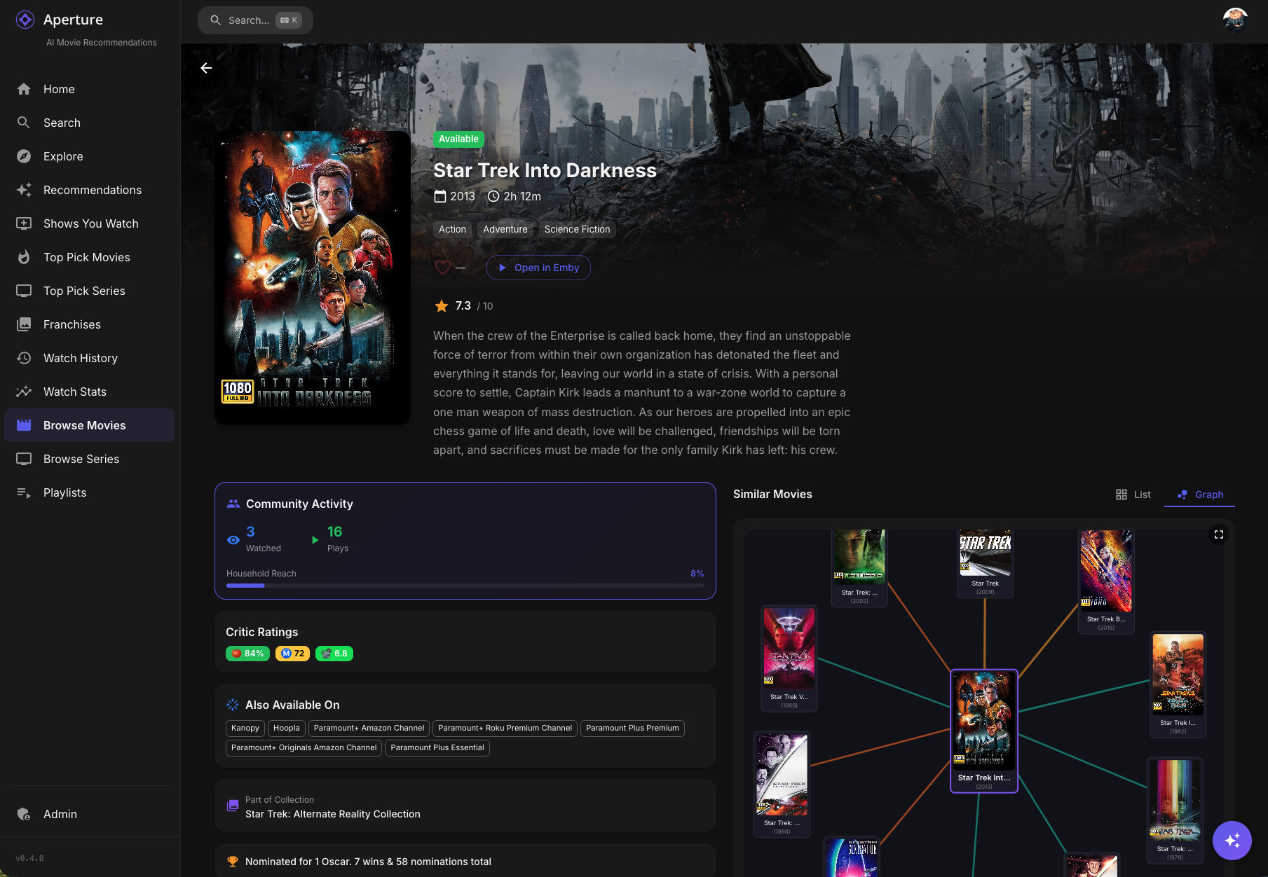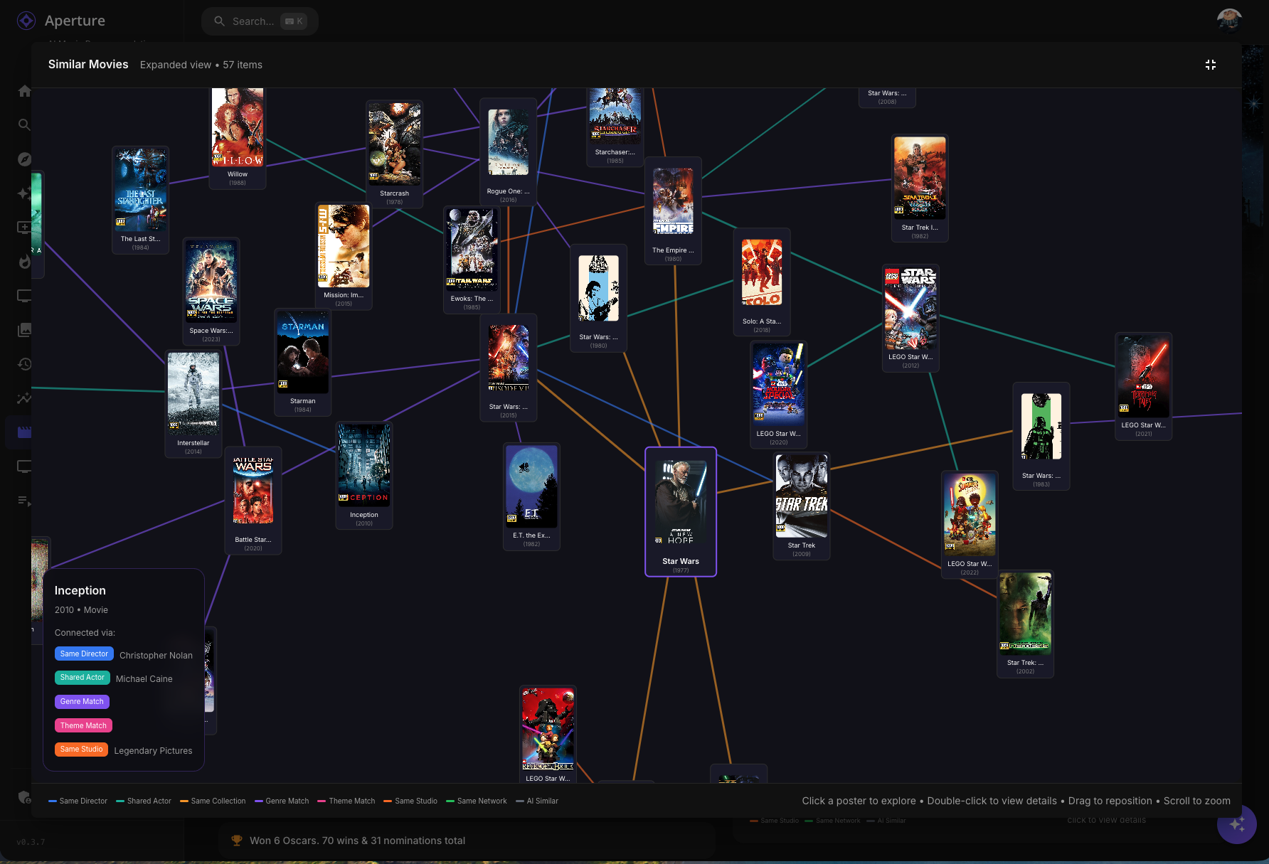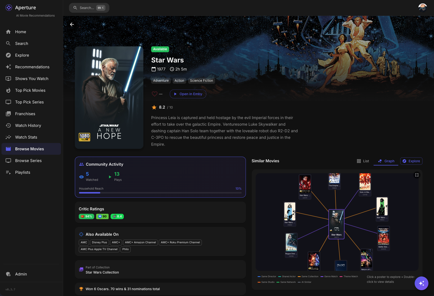 TheGru 143 Posted January 13 Author Posted January 13 (edited) Aperture v0.4.1 Release Notes Hey everyone! This is a major feature release introducing Similarity Graphs — a new interactive way to explore connections between movies and series in your library. Plus, you can now create playlists directly from your graph explorations! Similarity Graphs Discover how your movies and series are connected through directors, actors, genres, collections, and more with our new interactive graph visualization. What It Does On any movie or series detail page, you'll now see a Graph tab alongside the traditional list view of similar content. This graph displays: Poster nodes — Each movie/series is shown as its actual poster Color-coded connections — Lines between posters show why they're related: Blue — Same director Teal — Shared actors Gold — Same collection/franchise Purple — Shared genres Pink — Shared keywords/themes Orange — Same studio Green — Same network (TV) 🩶 Gray — Vector similarity (AI-detected) Emerald — AI Discovery (bubble breaker) Interactive Features Click any poster to refocus the graph on that item (rabbit-hole exploration!) Double-click to navigate to that movie/series detail page Drag posters to rearrange the layout Scroll to zoom in and out Hover on connections to see detailed relationship info Breadcrumb navigation tracks your exploration path Fullscreen Mode Click the fullscreen button to expand the graph for immersive exploration: Graph expands to 3 levels deep — see connections of connections of connections More items displayed (up to 35 nodes) Create Playlist button to save your discoveries Same drag/zoom/click interactions Smart Bubble Breaking The graph is smart about preventing you from getting stuck in a franchise bubble: Collection Limits The graph won't show all 26 James Bond films — it intelligently limits items per franchise Larger franchises get slightly higher limits to stay representative This encourages discovery of diverse content AI-Powered Escape When the graph detects you're stuck in a bubble (too many items from the same collection), it calls the AI to suggest thematically similar content from different franchises: These AI discoveries appear with emerald green connections They're semantically related but offer fresh perspectives Example: If exploring Star Wars, AI might suggest Dune, Battlestar Galactica, or Foundation Connection Validation The graph validates connections to prevent weird matches: Title pattern detection — Catches when movies match only because they both have "Return of..." in the title Genre gating — Requires at least one shared genre for a valid connection Collection diversity — Prevents unrelated franchises from chaining together Graph Playlists Turn your graph explorations into playlists that sync to your media server! Creating a Playlist Open a similarity graph and go fullscreen Explore until you have a nice collection of related content Click Create Playlist Choose a name (or click for AI-generated name) Add a description (or click for AI-generated description) Click Create What Happens Playlist is created in Emby/Jellyfin with all the graph items Description/overview syncs to your media server A record is saved in Aperture for tracking Graph playlists appear on the Playlists page with a hub icon badge Managing Graph Playlists View all playlists (both channel-based and graph-based) on the Playlists page Delete with a confirmation dialog (no more accidental browser confirms!) Graph playlists show their source item and item count Similarity Graph Preferences New user preferences to customize your graph experience: Hide Watched Content (Default: ON) When enabled, movies and series you've already watched won't appear in the similarity graph. This helps you discover new content rather than seeing things you've already seen. Full Franchise Mode (Default: OFF) When enabled, the collection limits are disabled and you can see entire franchises in the graph. Useful when you want to explore all entries in a series like James Bond, Marvel, or Star Trek. Access these settings: User Settings → Preferences tab → Similarity Graph section Getting Started Update to v0.4.0 which will run database migrations Navigate to any movie or series detail page You will see the Graph tab to see the similarity visualization Explore! Click posters to dive deeper, double-click to visit detail pages Go fullscreen for the full experience with playlist creation Migration Notes Three new database migrations will run automatically: 0072_similarity_validation_cache.sql 0073_graph_playlists.sql 0074_similarity_preferences.sql No manual intervention required. Enjoy exploring your library in a whole new way! Let me know if you have any feedback or run into issues. Edited January 14 by TheGru 2