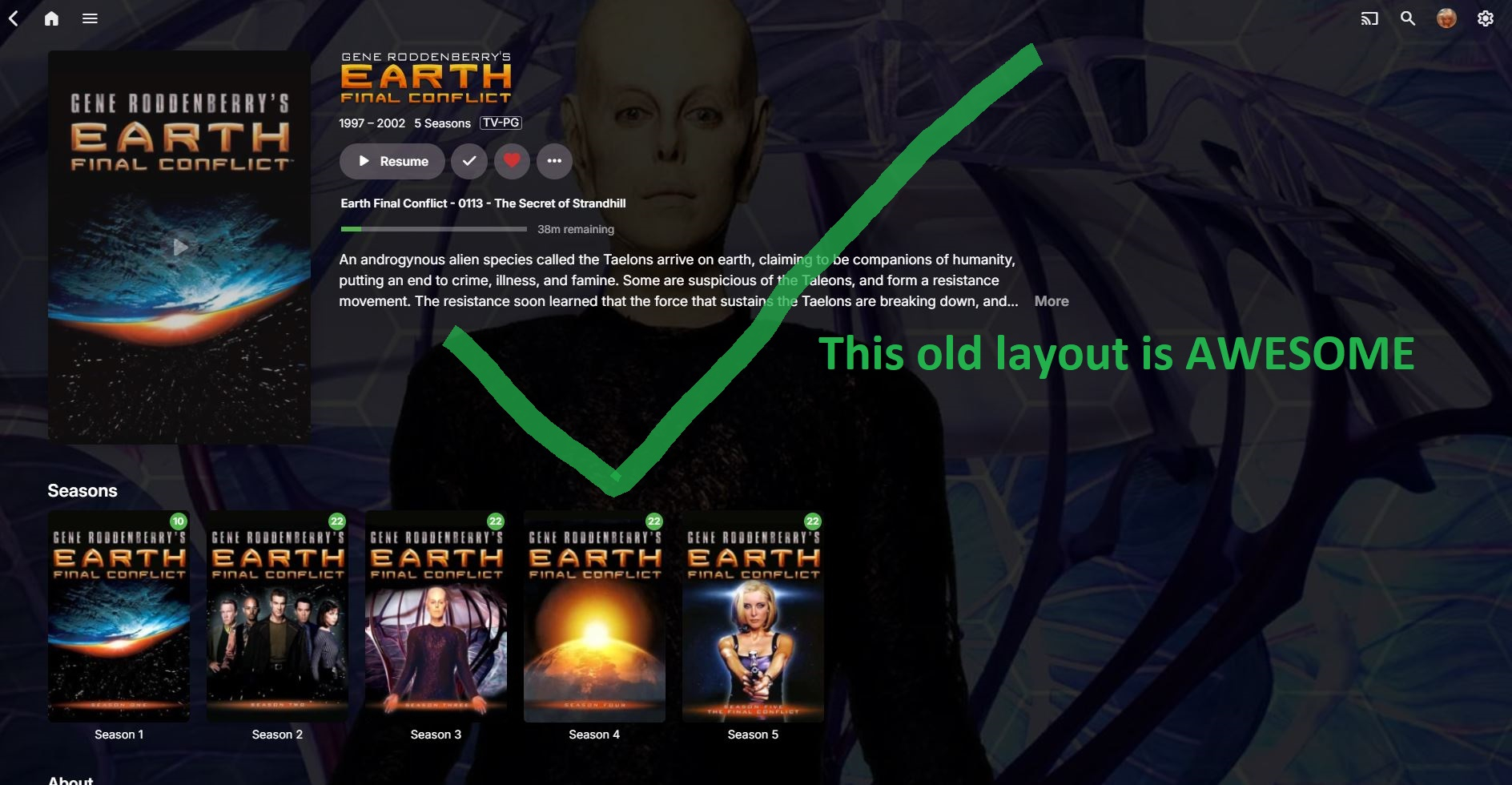 DarWun 349 Posted January 21 Posted January 21 6 hours ago, GHynson said: I've read comments in the forum that setting the user layouts via "Emby Server -> Users -> (select user) -> Edit this user's profile, etc -> Display -> Set Preferred TV Show display to Always show season folders" set's the layout back to folder views. I've noticed it does indeed change the current users layout back to folder views, but that only applies to to the current logged in user on "that device". It does not take affect on each users "different" device or future "New Device" logins. For example, I've logged into the same account from four separate devices, from three separate locations. When logging on to that users account on any new device for the first time, the user layout is defaulted to the new Drop-Down, Side scroller view. The four screens attached are from the same user account . Home Office PC (At Home): Logged in and changed the layout back to Old Folder view, which sticks and shows with any future logins on this device only. Work Office PC (At Work): Logged for the first time, same user, and it's defaulted to Drop-Down, Side-Scroller view. I have to manually change the layout again. Laptop PC (Parked at some shady looking warehouse in the slum side of town): Logged in for the first time with same user on the laptop, and it's defaulted to Drop-Down, Side-Scroller view. I have to manually change the layout again. Living Room Fire TV (Living Room): Logged in again after previously setting the user layout back to old folder view the other day, layout was saved to folder view. Yay! So in short, You will have to manually change the layout view to the old folder view, for each user account, on every device, every time you login for the first time. Home Office-PC Work Office PC Laptop PC Living Room PC Hi @GHynson. I don't have any input on the issue you are are posting about in this thread. But I do have a question based on the images you provided for Babylon 5. Recently I noticed that the season names for that series have been changed from "Season 1", "Season 2", etc. to the secondary titles "Signs and Portents", "The Coming of Shadows", etc. based on metadata scraped from TVDB (and TMDB). In your images, the season names are all still identified as "Season x" which I would prefer. I'm just curious if you had to manually edit the season metadata to get that to happen?