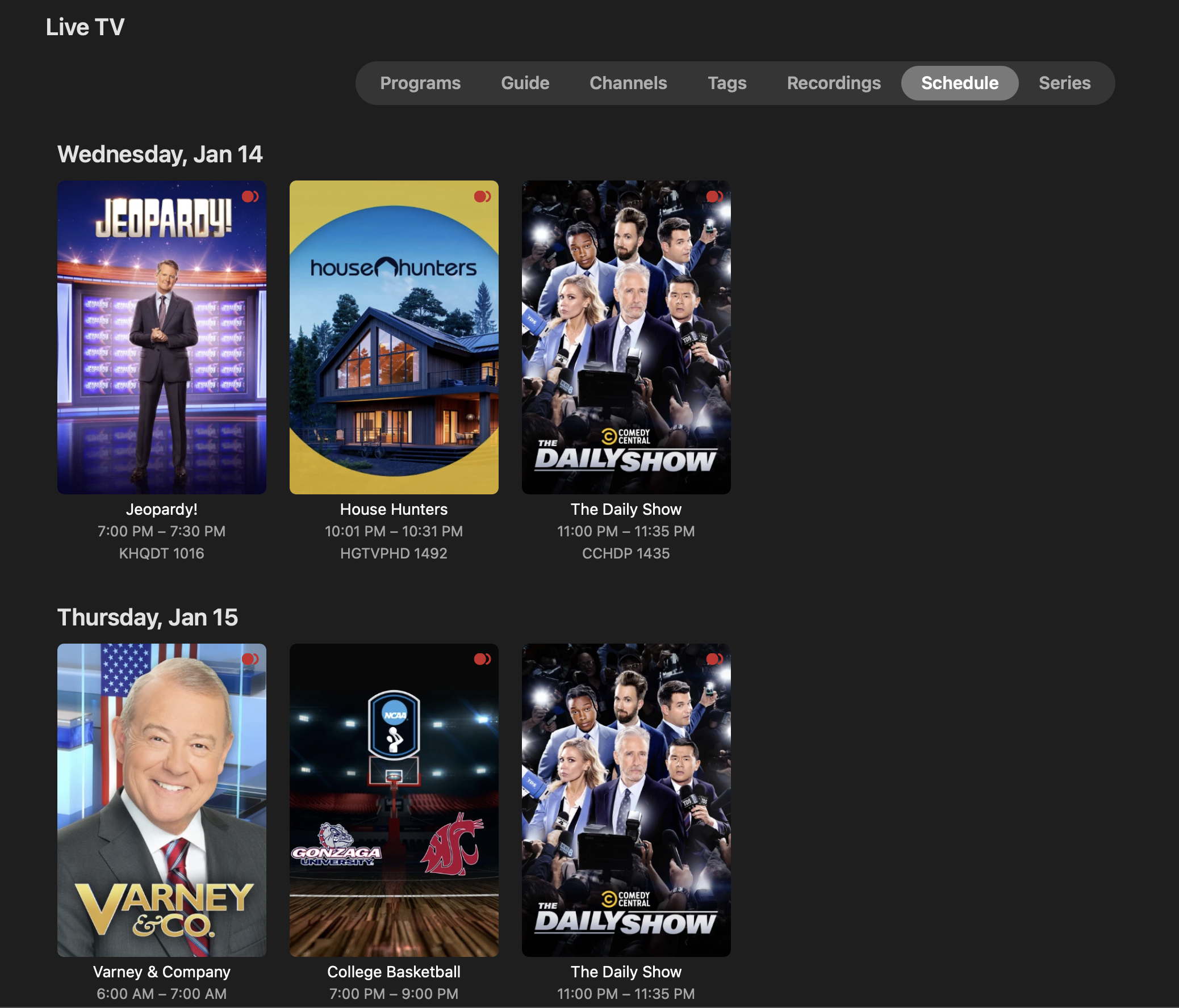 knoll126 10 Posted January 14 Posted January 14 (edited) Weird thing I noticed today. I have plenty of series setup, but they are not appearing on the Schedule tab. Jeaopardy! was not showing, I removed it from the series recordings and then added it back, it then showed up in the Schedule tab. But for example Varney & Company airs tomorrow morning and is not on the schedule. EDIT: I also just realized that Jeopardy! is showing the next record date of 1/19, when it appears there are new episodes the rest of this week. Edited January 14 by knoll126