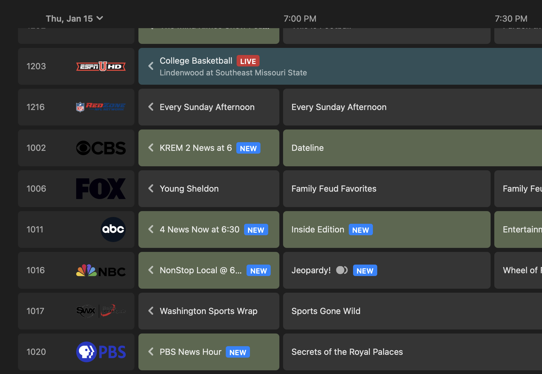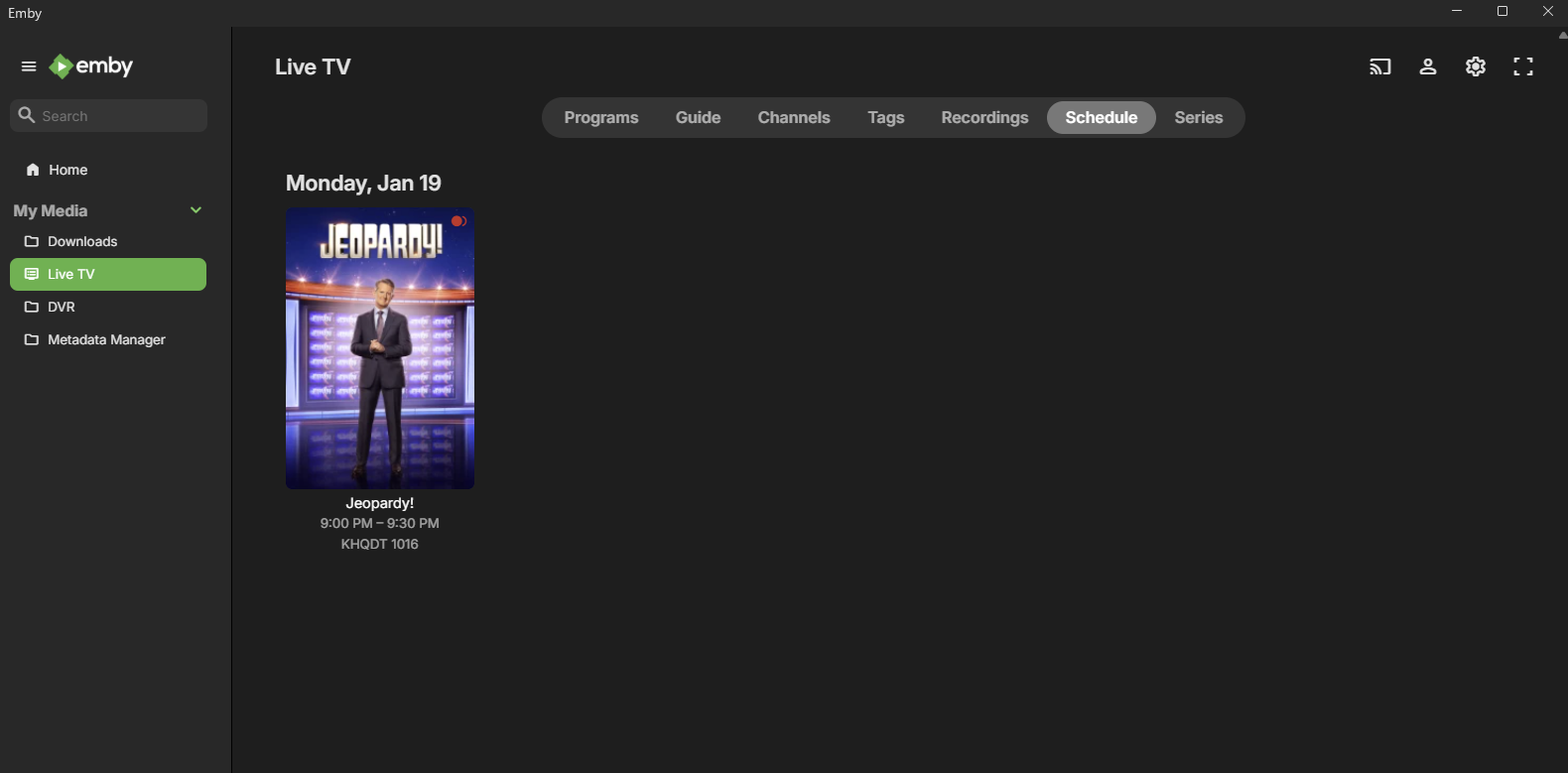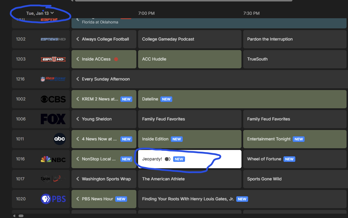 knoll126 10 Posted January 14 Author Posted January 14 14 hours ago, Luke said: Hi, what makes you think the jeapordy series should be picking up more? Emby guide shows new episodes for yesterday (13th, see screenshot), today, tomorrow and Friday. As of right now it is showing a recording for Today (didn't show this yesterday, again see screenshot above) and nothing the rest of the week. See screenshot below for Thursday, where Emby Guide says the listing as "New" with it not recording.