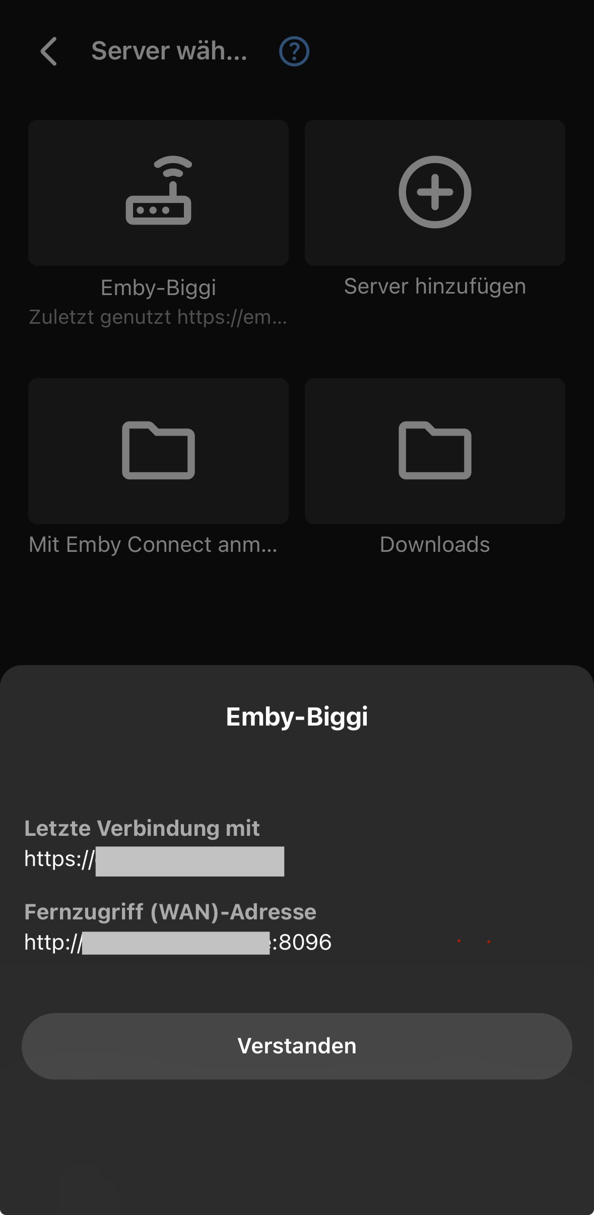 Babatom 6 Posted January 21 Author Posted January 21 Ich bekomme das Problem nicht in den Griff. Habe mal meine Netzwerk Einstellung gescreenshottet, vielleicht sieht jemand den fehler! Ich kann mich Intern einloggen mit 10.18.2.2:8099 Von extern geht es mit emby.meinedomain.de Beides funktioniert bis ich die App komplett schließe, dann kommt immer der Fehler aus Post #5. ( iOS & tvOS ) emby.meinedomain.de wird von Caddy (VPS) auf 10.18.2.2:8099 geroutet, habe CGNat deswegen ein VPS. ----- Ich habe außerdem Emby Connect probiert, mein Admin Account mit meinem Emby Account verbunden. Dann einen neuen User erstellt, vorher für diesen ebenfalls einen Emby Account angelegt und dann eingeladen. Der User verbindet sich auch und ich sehe meinen Server aber wenn ich darauf klicke bekomme ich wieder "Verbindung zum Server nicht möglich". ( Diese Verbindung soll auch von extern erfolgen )