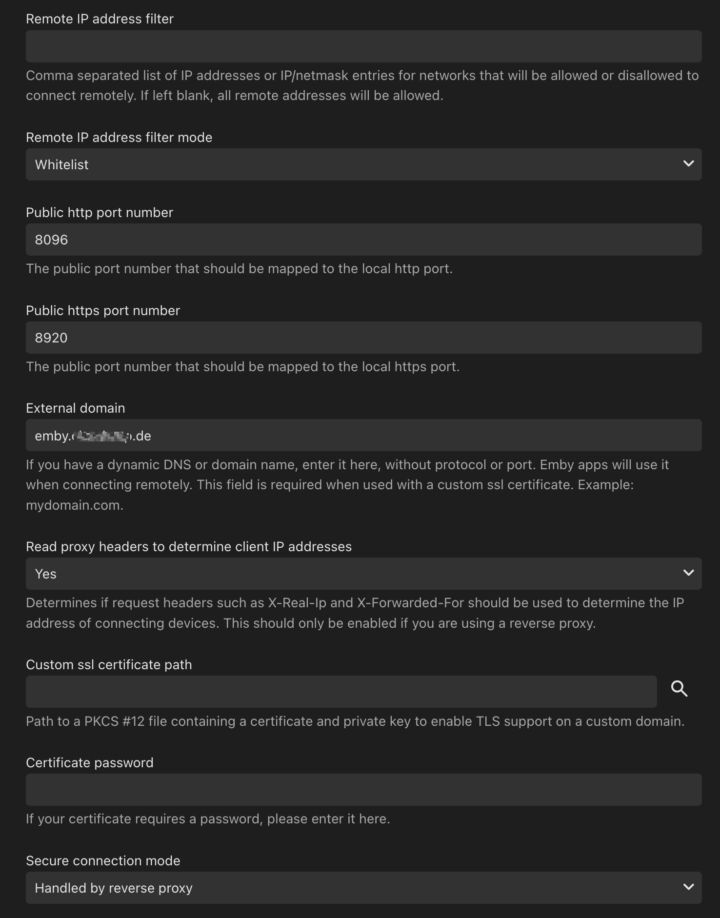 Babatom 6 Posted January 30 Author Posted January 30 1. Allow remote connections to this Emby Server must be enabled. 2. Enter the domain under "external domain" 3. "Secure connection mode" -> handled reverse proxy Thats works for me. The app only failed to save the changes when I changed the default port to 8096 in the container template, but the connection always worked for me.
