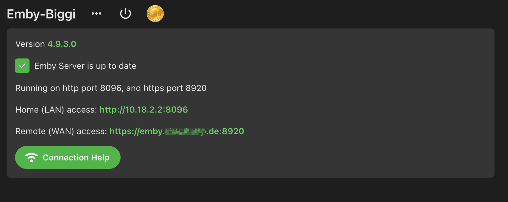 Babatom 6 Posted January 16 Posted January 16 Hi, ich teste gerade Emby, Server ist auf Unraid installiert mit Portmapping 8099:8096 weil Jellyfin schon auf 8096 läuft. Sobald ich die App schließe iOS & tvOS bekomme ich immer den Fehler "Server muss aktualisiert werden" und er zeigt mir die "ServerIP :8096" an obwohl ich beim einrichten ja Port 8099 angegeben habe. Ist das ein Bug oder mache ich was falsch? In den Server einstellungen unter Übersicht zeigt er mir auch an : Heimnetzwerk-Zugriff (LAN): http://10.18.2.2:8096.
