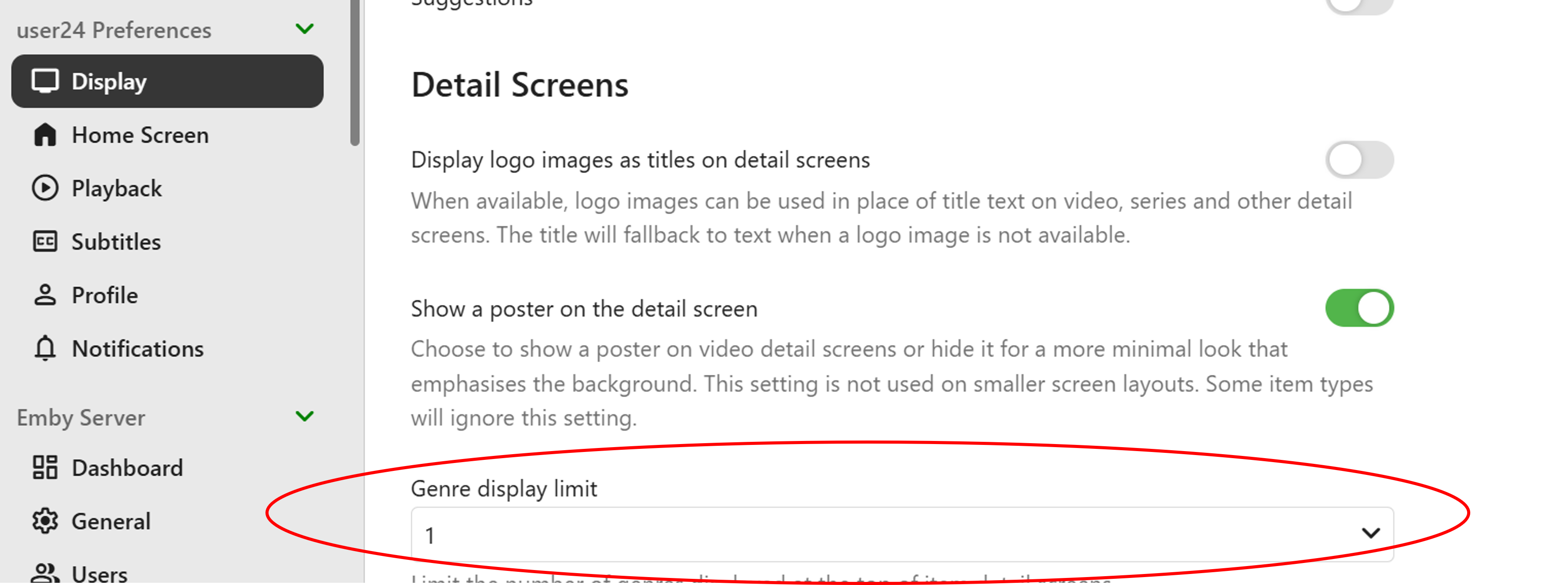 podonnell 47 Posted January 17 Author Posted January 17 1 hour ago, user24 said: This is one way you could try, if you haven't already. It's a bit manual (with Emby settings) though and you might be wanting something more automatic via the provider?? Go to Settings Display Preferences and limit the Genres display to 1: Then Edit the metadata of the individual Movies and rearrange the Genres order: For this example, only Crime will then display at the top: All Genres still appear at the bottom - but now in your selected order. Someone else may know a different/better/automatic way??? I appreciate this idea and the very nice screenshots. You're right though -- I'm hoping for a more automated way to automatically show the most relevant genre. It's possible Emby is ordering them in some way already, and I might just need to limit it down to 1 or 2. What I'm concerned about is if I limit genre to 1 I might have a genre show up that is not the primary genre of the movie. Which from the looks of TheMovieDB, they have the genres ordered by most relevant.