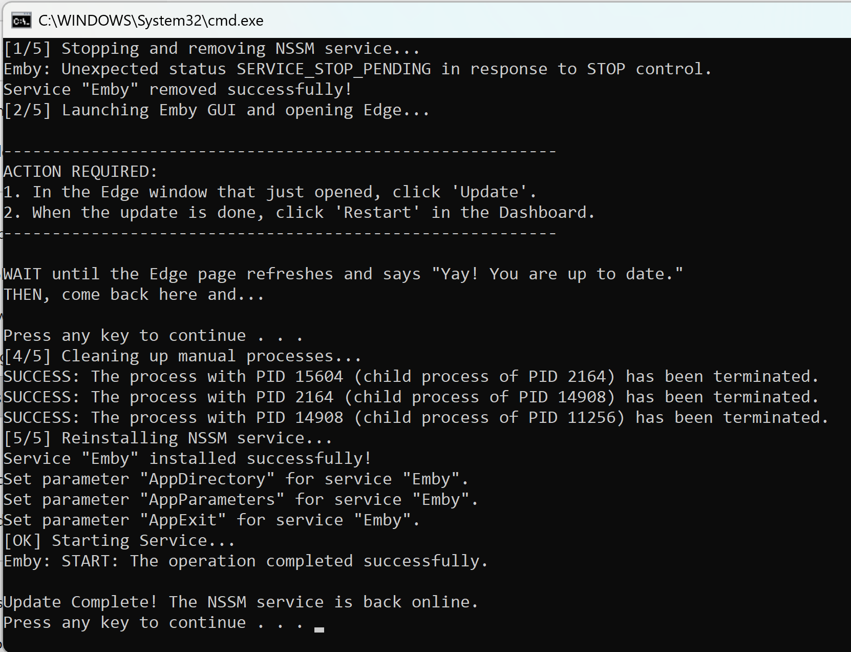 Marthastewart 2 Posted January 16 Posted January 16 I have Emby Server installed on windows 11 running as a service through NSSM. Whenever I do the manual update, to get a new version of Emby something always messes up (database corrupted, user profile missing etc). I have given up on that manual install or Emby Server to update it process. My work around is to delete the NSSM service for Emby -> update Emby in the web GUI (update, then restart) -> then resetup Emby as a service through NSSM. This manual process always works, but takes like 5 or 10 minutes of manual clicking. However, I never have an update issue. So I decided to make a script out of it, which mostly automates the entire process (see attached .txt file for script). Save the script as a .bat file extension run script as admin (you will see terminal pop up and sit there with an explanation - see attached screenshot) it will relaunch Emby for you (assume in Edge browser) You need to click update Emby in GUI You need to click restart Emby You need to go back to terminal window and press any key to resume script -> Emby is configured as a service again. Done. ---------------------------- This assumes that you have OS Windows 11, Embyserver installed on it, and NSSM installed. See attached screenshot for sample output of script if interested. The only thing you should need to change is the "sets" at the beginning of the script. Set 1 - whatever you currently have NSSM service called to run Emby as a service. I simply named mine "Emby" Set 2 & 3. You need to update your windows 11 user profile name. My windows user profile is called "Emby". Yours might be Bob or whatever "users\bob\appdata etc" Set 4 leave it alone @echo off setlocal :: --- CONFIGURATION --- set "SERVICE_NAME=Emby" set "EMBY_EXE=C:\Users\Emby\AppData\Roaming\Emby-Server\system\EmbyServer.exe" set "EMBY_DIR=C:\Users\Emby\AppData\Roaming\Emby-Server\system" set "DASHBOARD_URL=http://localhost:8096/web/index.html#!/dashboard" :: Admin Check net session >nul 2>&1 if %errorLevel% neq 0 ( echo [ERROR] Please run this script as Administrator. pause exit /b ) echo [1/5] Stopping and removing NSSM service... nssm stop "%SERVICE_NAME%" nssm remove "%SERVICE_NAME%" confirm echo [2/5] Launching Emby GUI and opening Edge... start "" "%EMBY_EXE%" start msedge "%DASHBOARD_URL%" echo. echo --------------------------------------------------------- echo ACTION REQUIRED: echo 1. In the Edge window that just opened, click 'Update'. echo 2. When the update is done, click 'Restart' in the Dashboard. echo --------------------------------------------------------- echo. echo WAIT until the Edge page refreshes and says "Yay! You are up to date." echo THEN, come back here and... echo. pause echo [4/5] Cleaning up manual processes... taskkill /F /IM EmbyServer.exe /T 2>nul timeout /t 2 >nul echo [5/5] Reinstalling NSSM service... nssm install "%SERVICE_NAME%" "%EMBY_EXE%" nssm set "%SERVICE_NAME%" AppDirectory "%EMBY_DIR%" nssm set "%SERVICE_NAME%" AppParameters "-service" nssm set "%SERVICE_NAME%" AppExit Default Exit echo [OK] Starting Service... nssm start "%SERVICE_NAME%" echo. echo Update Complete! The NSSM service is back online. pause
