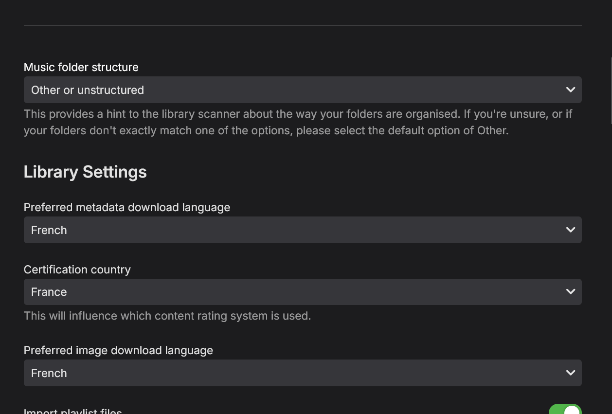 mrjay42 5 Posted January 19 Posted January 19 Hi all, My problem My Audio Books' metadata are not fetched from the internet/detected/retrieved from the metadata "service". So lately, ALL my newly added audio books look like this: (You can probably notice that the audio books are in French, maybe the problem is related to this? My server's display language is English, some of the content available on it is in French. That doesn't cause any problem for the other types of content: films, TV series, etc.) Older ones ("older" as in added on my Emby before a certain date (undefined right now, is it before a particular update of Emby? a plugin?) look like that: You can see that most of them are/were correctly detected. What I have tried Restarting Emby "Forced" refresh metadata "Forced" scan library files" Fidgeting in the options -> didn't find anything significant, that's actually the first reason I'm posting here Tried to identify manually, and this the most interesting -> when I type the correct title of an audio book -> emby immediately displays "No items matching your search criteria were found." -> it doesn't really search, it feels like there's no http request to any API or anything happening. (see screenshot below) ----> this is actually the second main reason for me posting this here. Pulling Emby's image (I'm using docker compose, with Portainer) Software Setup I self host my Emby server on a PC in my home, but I access it through the internet via reverse proxy (see the docker compose below if you're interested) OS: Linux Debian Stable - Debian GNU/Linux 13 (trixie) Emby: Version 4.9.3.0 Docker Compose stack version: "2.3" services: emby: image: emby/embyserver container_name: embyserver #runtime: cpu # Expose NVIDIA GPUs networks: - private_secured_network #network_mode: bridge # Enable DLNA and Wake-on-Lan environment: - UID=1000 # The UID to run emby as (default: 2) - GID=1000 # The GID to run emby as (default 2) - GIDLIST=1000 # A comma-separated list of additional GIDs to run emby as (default: 2) - NVIDIA_VISIBLE_DEVICES=all - NVIDIA_DRIVER_CAPABILITIES=compute,utility,video volumes: - /home/bla/Desktop/apps/emby:/config # Configuration directory - /home/bla/Desktop/data/Downloads/transmission/completed:/mnt/share1 ports: - 8096:8096 # HTTP port # - 8920:8920 # HTTPS port deploy: resources: reservations: devices: - driver: nvidia count: all capabilities: [gpu] restart: always labels: - "traefik.enable=true" - "traefik.http.routers.emby.rule=Host(`jayflix.bla.stream`)" - "traefik.http.routers.emby.entrypoints=websecure" - "traefik.http.routers.emby.tls.certresolver=myresolver" - "traefik.http.services.emby.loadbalancer.server.port=8096" networks: private_secured_network: external: true But that shouldn't matter for the problem at hand. Plugins I don't know if this is of any importance, but this is a screenshot of the installed plugins Logs I have attached the latest logs from my Emby server embyserver.txt