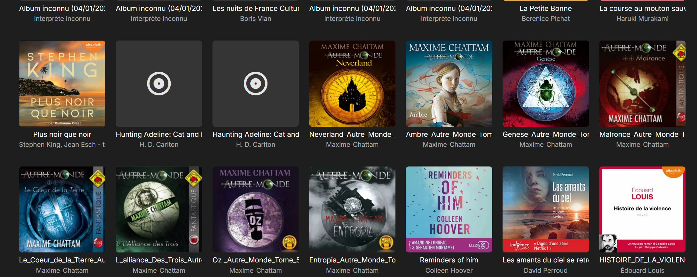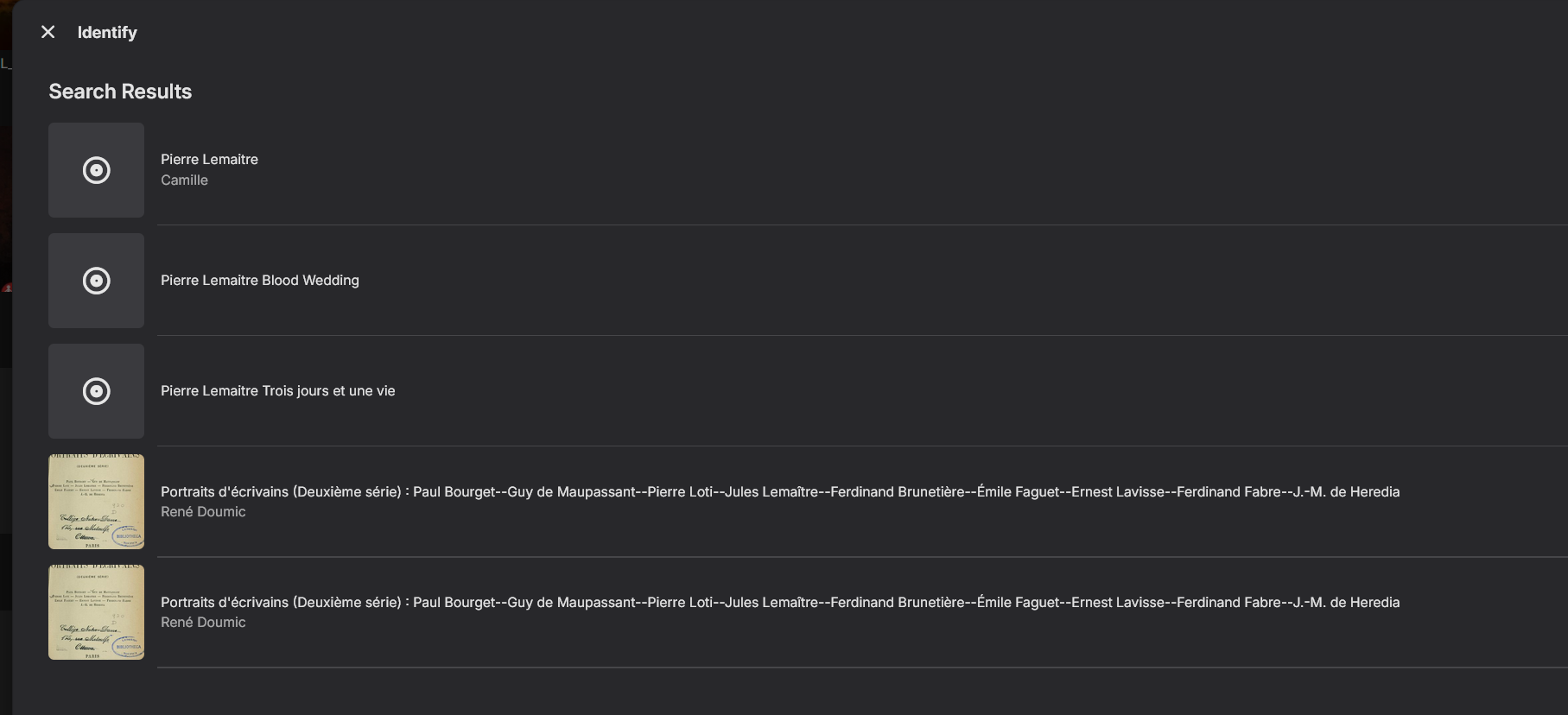 mrjay42 5 Posted January 27 Author Posted January 27 Ok so here's what I did: As suggested by @brothomI have installed/enabled the following plugins "TheAudioDB" and "OpenLibrary" I selected them as the metadata manager for my library called "Audiobooks" And I went to my favorite website and downloaded the most well-known and most available audiobook, which is "Dune - Frank Hebert", in French. Because my "audiobooks" library is ONLY in French And all the metadata were retrieved perfectly and immediately for THAT BOOK BUT I have so many other books that are NOT identified!! Even when I try to do it manually: For instance, you can see in the bottom row of the above screenshot, books by "Pierre Lemaitre" who is, without any doubt, a famous author (https://en.wikipedia.org/wiki/Pierre_Lemaitre ) in wikipedia page is literally translated in THIRTY languages. This is not an old obscure random unknown author. And when I type HIS NAME, in the search bar, to identify manually one of his books, I get this: Literally nothing. And when I search for the book title "sacrifices", I obviously get a long list but NO book by Pierre Lemaitre. So, the questions remain: Did I do anything wrong? Is there some kind of metadata manager/fetcher that is adapted to French authors/books/audiobooks? Did anything change recently in Emby that could cause this problem to emerge? Thanks again to all of you for your help Thanks @Luke@brothom