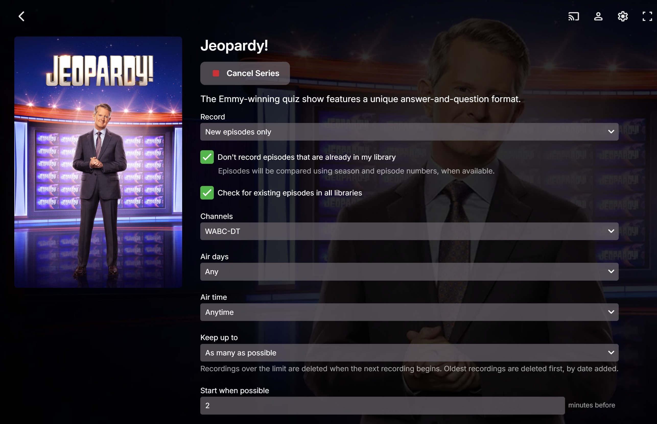 Luke 42077 Posted January 22 Posted January 22 1 hour ago, Sorahl said: a number of ways. one way i have done it was to go to the guide, go to a showing of one of them and click on the program. then i clicked record series the other way i have done it was from Recordings I click Add Recording then guide and also search and look for Jeopardy or Wheel of Fortune, then the same. both methods result in the same behaviour. the scheduled recordings are there today, and then gone tomorrow. Can you please show a screenshot of the series recording options? Thanks.