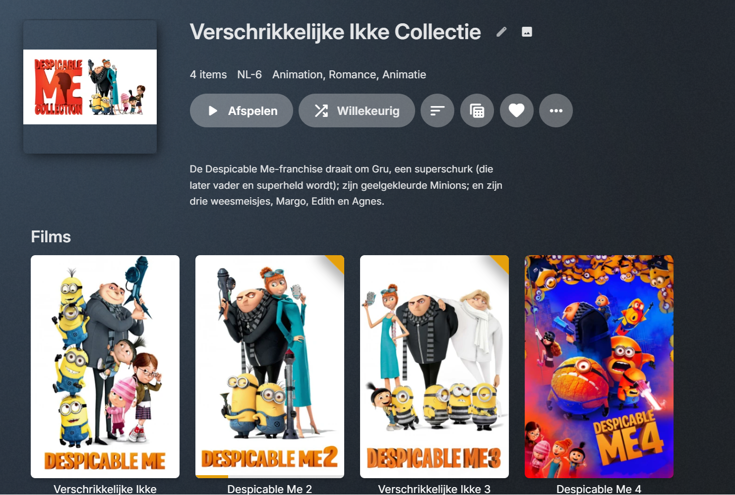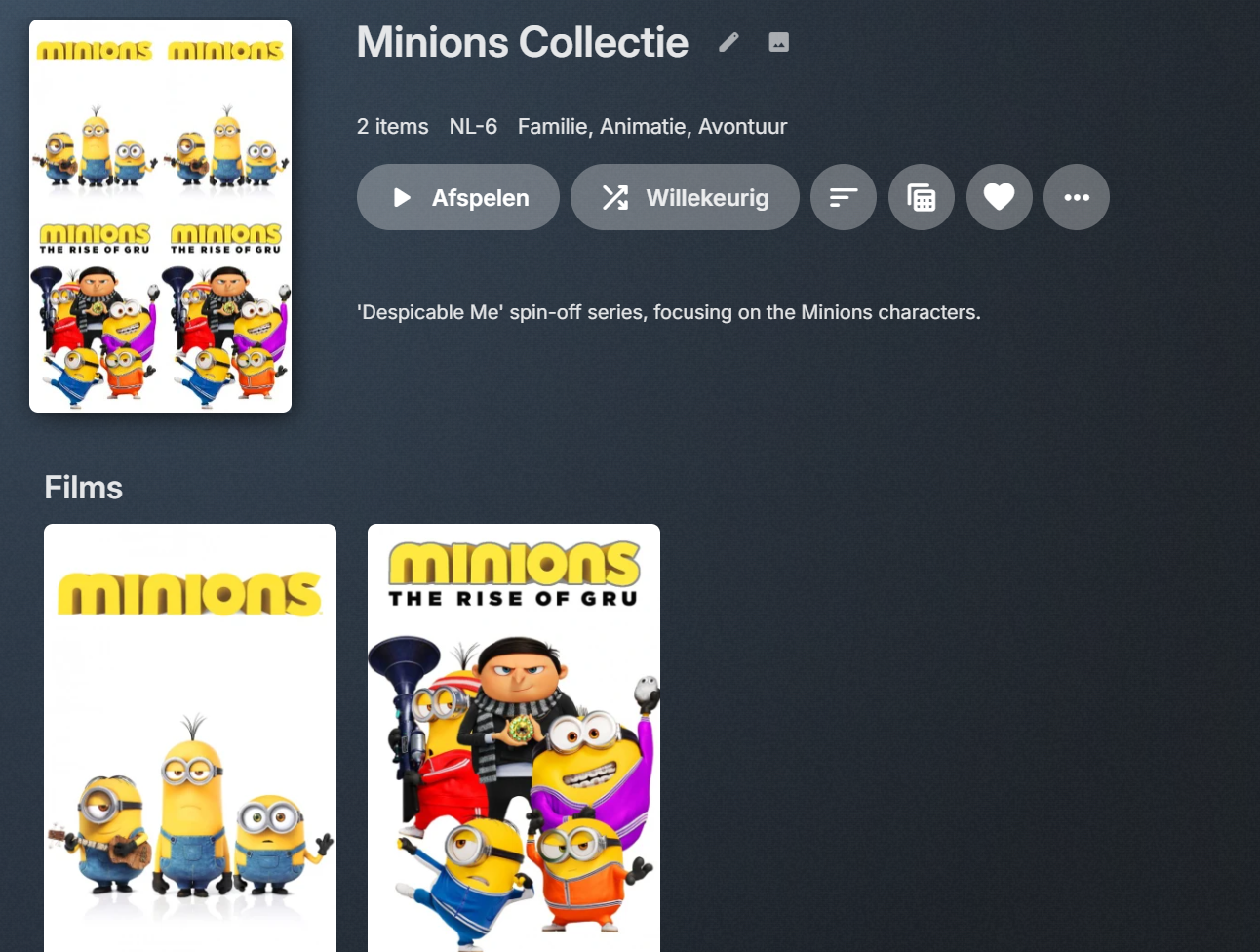 Davey's 37 Posted January 24 Posted January 24 I see that editing is possible in Windows, but how does this work in my case in DSM and later in Ugos? https://emby.media/community/index.php?/topic/112183-editing-a-collection/ I wanted to watch the Minions with the kids this week, I had forgotten that the films started with Despicable Me and so I started the film from the Minions collection but when seeing the 2nd the rise of gru it became clear that these were not the right films. I also have more movies called minions, but apparently they are not in the collection then of course I also have the collection: How can I either merge or link these so I can understand the purpose of collections?