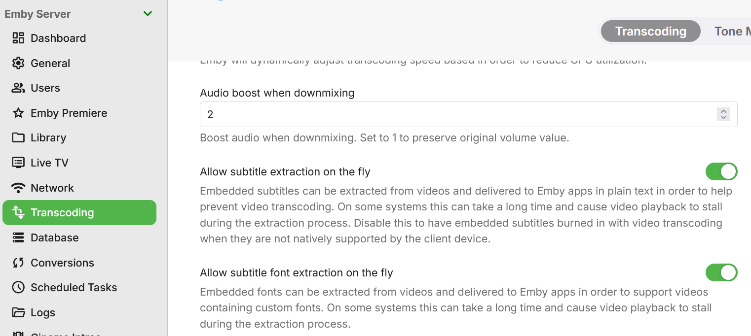 RanmaCanada 494 Posted January 31 Posted January 31 I would advise you get an Intel Arc or a cheap Nvidia Quadro like a P620 as the Ryzen 5 2600 is "weak" (by today's standards) and you are doing software transcoding which does have lag when starting and stopping, where as hardware encoding does not have as pronounced lag. I am only presuming this as you have not stated what video card you have in your server. I have noticed that when watching anime, if the system has to transcode due to your device not being able to playback the content directly, it can screw up subtitles if you fast forward or pause if your tab looks like below, ie "normal". Ideally they should be burning in the subtitiles on playback if their device has to transcode. There should be an option in their player, or you can force it in the transcoding tab. Just turn off Allow Subtitle extraction on the fly and Allow Subtitle font extraction on the fly. This will be a heavier load on your server as burning in subtitles is a single threaded process, last I checked.