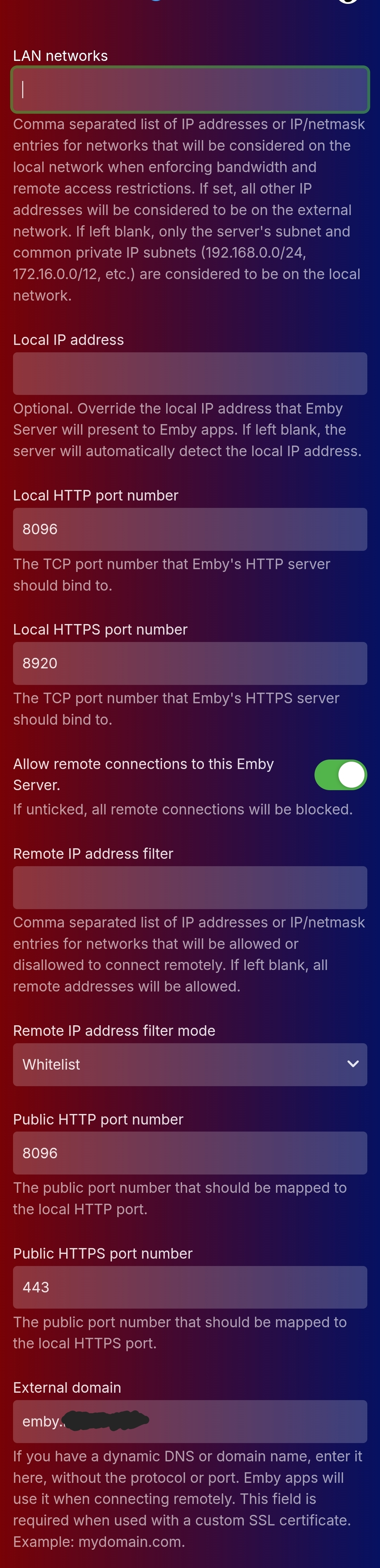 notla49285 48 Posted February 8 Author Posted February 8 5 minutes ago, Q-Droid said: Which URL are you using to connect in the apps? Apps don't like or follow HTTP redirects so your entry above could be a problem. I have now removed that as that did seem to be causing issues but I still have the same problem with the apps. I'm signing in with Emby Connect, it's picking up my server's address as https://emby.mydomain.net:443 and can't connect to it at all.