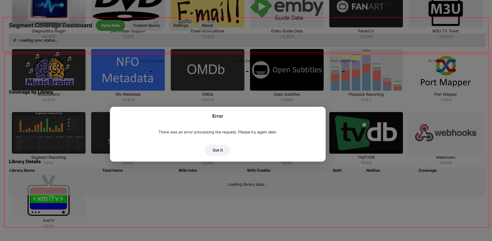 Neminem 1518 Posted February 10 Posted February 10 (edited) Just trying this beast I did run the scheduled task to sync. When clicking the plugin I get this error. And it looks like its running behind the plugin page. Using Edge, also tried in Firefox. Logs rotated with Debugging. embyserver (4).txt Guess there is something missing. *** Error Report *** Version: 4.9.3.0 Command line: /system/EmbyServer.dll -programdata /config -ffdetect /bin/ffdetect -ffmpeg /bin/ffmpeg -ffprobe /bin/ffprobe -restartexitcode 3 Operating system: Linux version 6.12.54-Unraid (root@Develop) (gcc (GCC) 15.2.0, GNU ld version 2.45-slack151) #1 SMP PREEMPT_DYNAMIC Tue Oct 21 15:58:46 PDT 2025 OS/Process: x64/x64 Framework: .NET 8.0.22 Runtime: system/System.Private.CoreLib.dll Processor count: 6 Data path: /config Application path: /system System.IO.FileNotFoundException: System.IO.FileNotFoundException: File not found: segment_dashboard.v1_0_1_2.v1_0_1_2.js File name: 'segment_dashboard.v1_0_1_2.v1_0_1_2.js' at Emby.Web.Api.WebAppService.Get(GetDashboardConfigurationPage request) at Emby.Server.Implementations.Services.ServiceHandler.ProcessRequestAsync(HttpListenerHost httpHost, IServerApplicationHost appHost, IRequest httpReq, IResponse httpRes, IStreamHelper streamHelper, RestPath restPath, String responseContentType, CancellationToken cancellationToken) at Emby.Server.Implementations.HttpServer.HttpListenerHost.RequestHandler(IRequest httpReq, RestPath restPath, String urlString, String localPath, String contentTypeInPath, CancellationToken cancellationToken) Source: Emby.Web TargetSite: System.Threading.Tasks.Task`1[System.Object] Get(Emby.Web.Api.GetDashboardConfigurationPage) Edited February 10 by Neminem 1