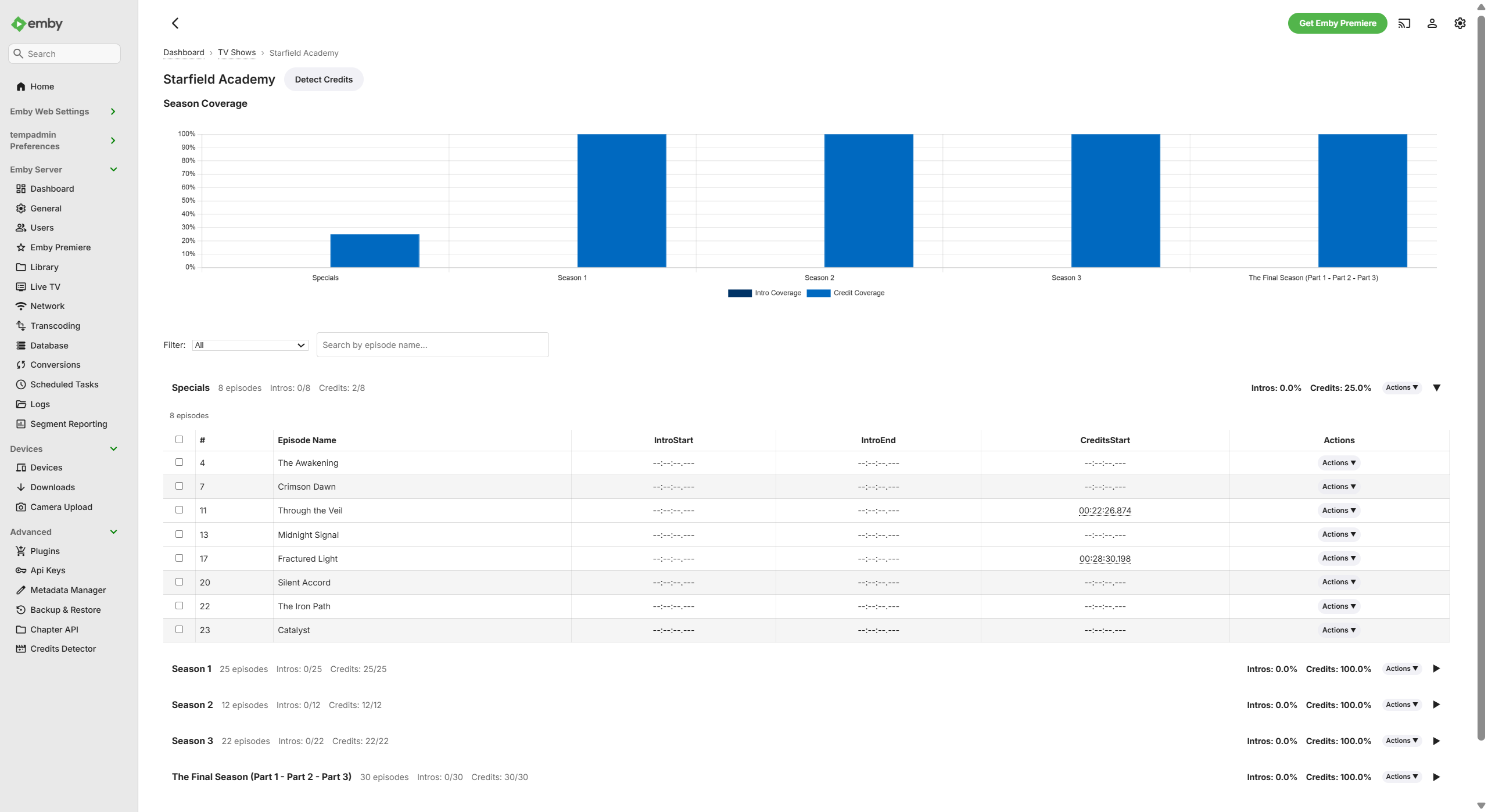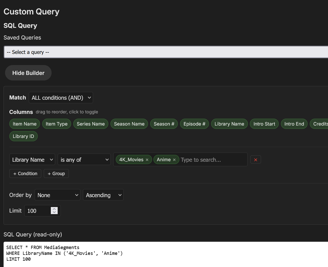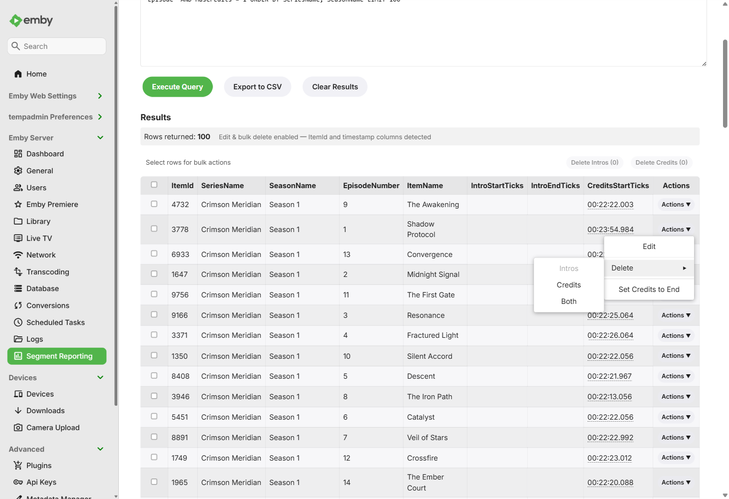 sydlexius 297 Posted February 10 Posted February 10 (edited) If you use intro detection or EmbyCredits, you've probably wondered: how many of my episodes actually have markers? Which seasons are missing credits? Did detection run on that library I just added? Emby doesn't give you an easy way to answer those questions. Segment Reporting is a plugin that fills that gap. It gives you a dashboard view of your segment coverage, lets you browse and edit markers, and provides bulk operations so you're not fixing things one episode at a time. Dashboard - see your coverage at a glance The dashboard shows segment coverage across all your libraries with summary stats and a per-library breakdown chart. You can see exactly how many items have intros, credits, both, or neither. Browse and drill down Click into any library to see per-series coverage stats, then drill into a series to see every episode laid out by season. Charts show intro and credits coverage per season so gaps jump out immediately. Edit timestamps inline Click any timestamp to edit it directly in the table. No need to navigate away or open a separate editor. Changes are saved to Emby immediately. Bulk operations Select episodes and apply operations in bulk: Copy segments from one episode to others (useful when a show has a consistent intro across a season) Set credits to end for selected episodes (for shows where credits run to the end of the file) Bulk delete intros or credits Detect credits for selected items (requires EmbyCredits) Custom query builder For anything the built-in views don't cover, there's a visual query builder with autocomplete, multi-value filters, drag-to-reorder columns, and sortable/exportable results. You can save queries for reuse. The builder generates SQL under the hood, so power users can see exactly what's running. Fields autocomplete from your actual library data: Query results support inline editing, row selection, bulk actions, playback links, and CSV export: Settings Choose from several chart color palettes (or define your own), toggle table styling, hide libraries from the dashboard, and manage the sync cache. The theme defaults to matching your Emby accent color. How it works The plugin maintains a lightweight SQLite cache of your segment data. A scheduled task syncs it daily (configurable via Emby's Scheduled Tasks). All reads come from the cache for speed; all edits write through to Emby first, then update the cache. Your Emby data is always the source of truth. Installation Download the DLL from GitHub Releases Drop it in your Emby plugins folder Restart Emby Run the initial sync from Scheduled Tasks Full documentation: User Guide | Release Notes | GitHub Built on patterns from @TeamB's Playback Reporting and ChapterAPI plugins, and integrates with @yocker's EmbyCredits for credits detection. Feedback, bug reports, and feature requests welcome here or on GitHub Issues. Edited Wednesday at 10:34 PM by sydlexius Updated pitch and provided two addl. screenshots. 2