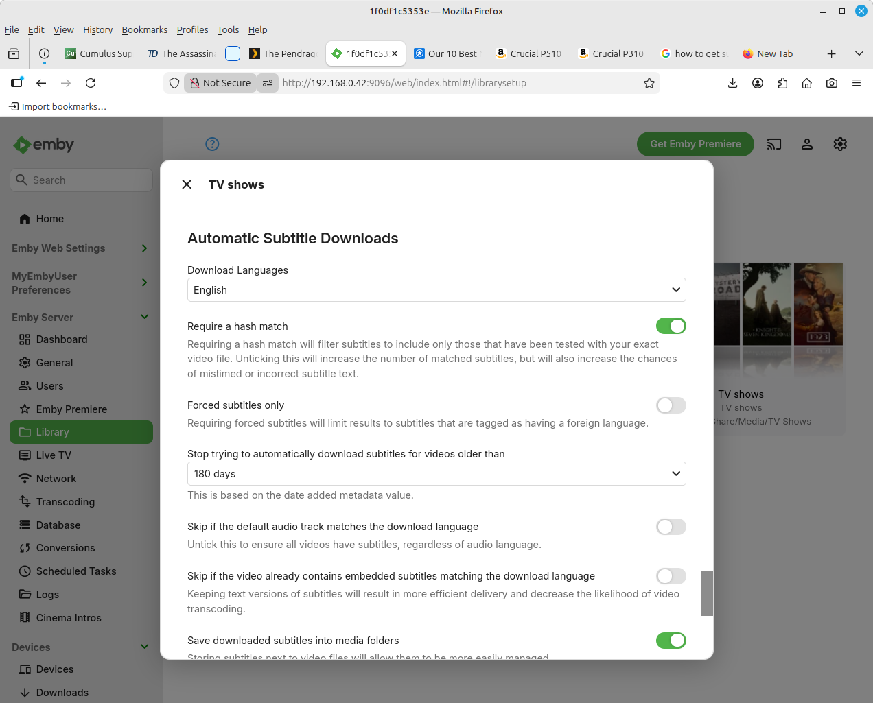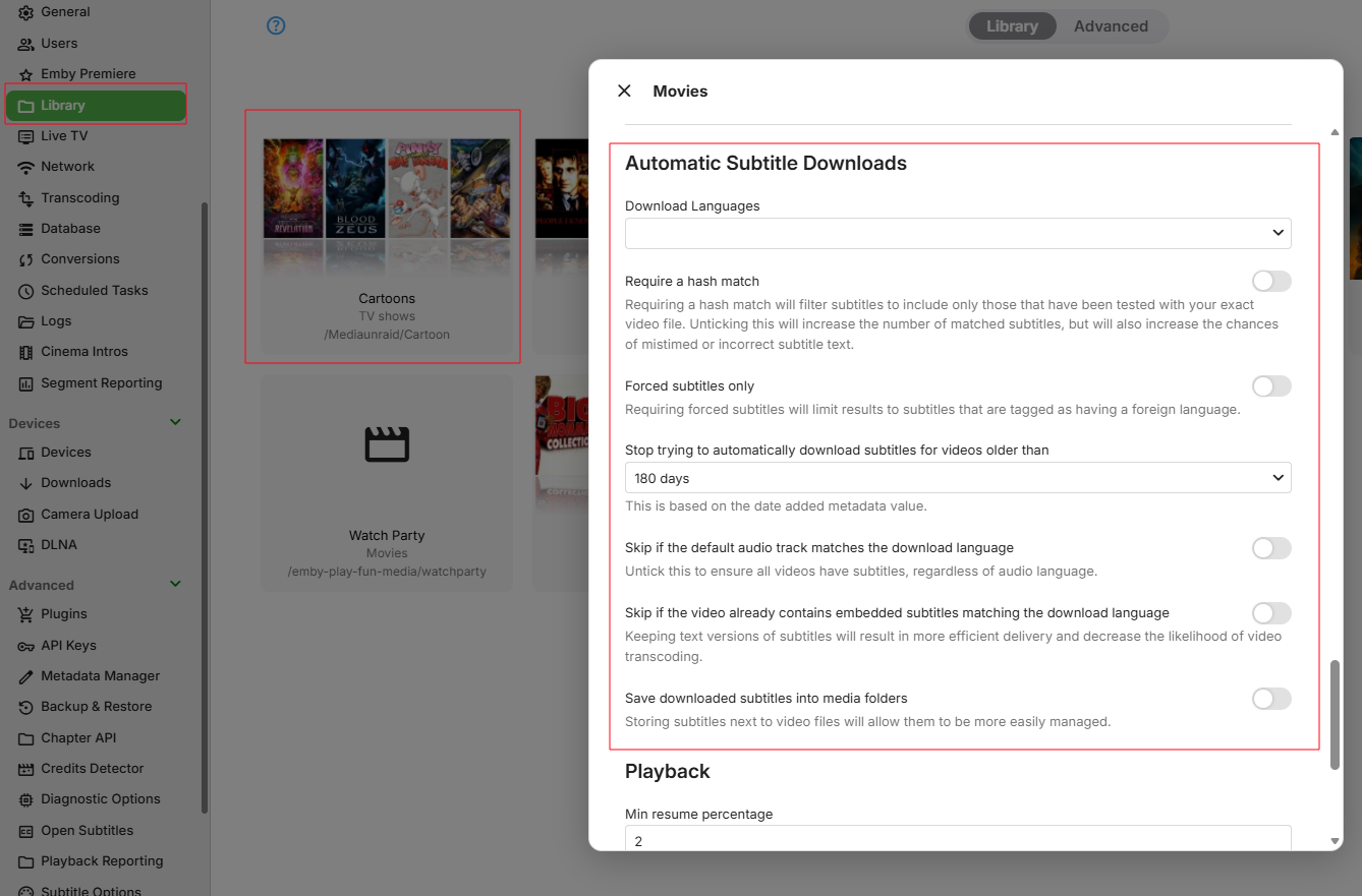 Robgh 4 Posted Saturday at 08:43 AM Author Posted Saturday at 08:43 AM (edited) For a start I followed this guide Automatic Downloads (Plugins): Go to your Emby Server Dashboard and click Plugins > Catalog. Install a plugin like Open Subtitles. Restart your Emby server. Configure the plugin in "My Plugins," then edit your media libraries to enable automatic downloads and set preferred languages. At the last point: ie Configure the plugin, I got this: (there is another part of the guide which says: Go to Settings > Subtitles > Subtitle Mode to set preferences. That option is not available for me) Edited Saturday at 08:57 AM by Robgh more information