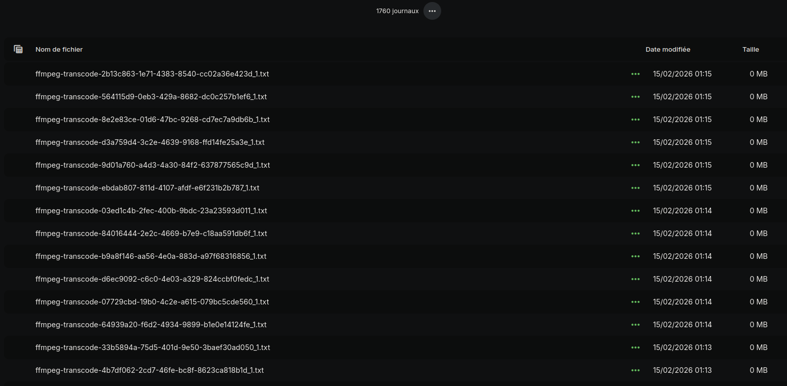 dmnmn 0 Posted Tuesday at 08:12 AM Posted Tuesday at 08:12 AM Hello, I have an issue with my Emby server. It happens, mainly in the evening, that when a media finishes, Emby retranscodes it, crashes, and this loops for several hours. I think this occurs when a user does not exit or falls asleep while watching a video. This generates hundreds of 0MB log files, all ending with "[q] command received. Exiting." It's impossible to stop the loop without restarting the server application or after a while. I am attaching the server logs, as well as one of the logs of this transcoding. Thank you, and have a nice day. embyserver.txt ffmpeg-transcode-6cdb9930-0540-4ee6-8695-b6da801587a9_1.txt