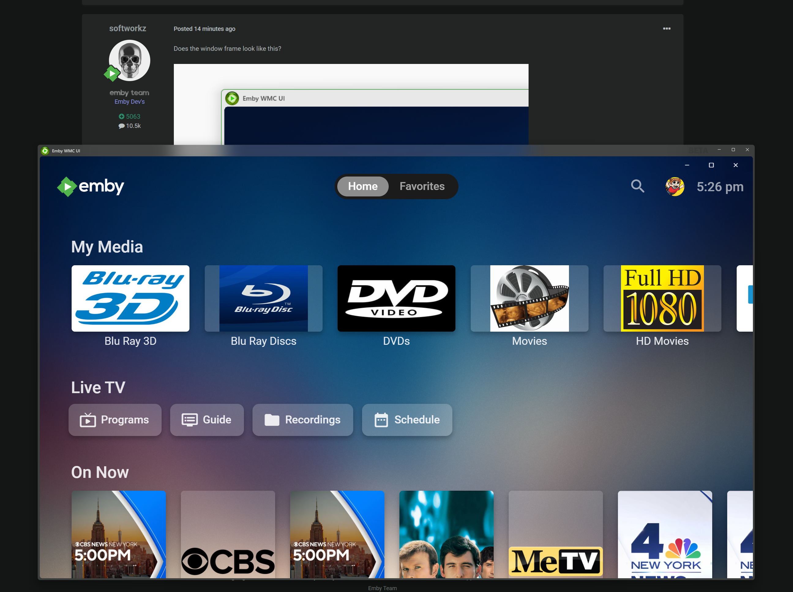 softworkz 5065 Posted 19 hours ago Posted 19 hours ago Hm - two options to try: Go to Settings >> Display >> Theme and see whether you can choose "RealWMC" Close the app, delete this folder: C:\Users\admin\AppData\Local\Packages\Emby.Client.WMC.WinUI_wjpzhde6g1vst\ and restart
