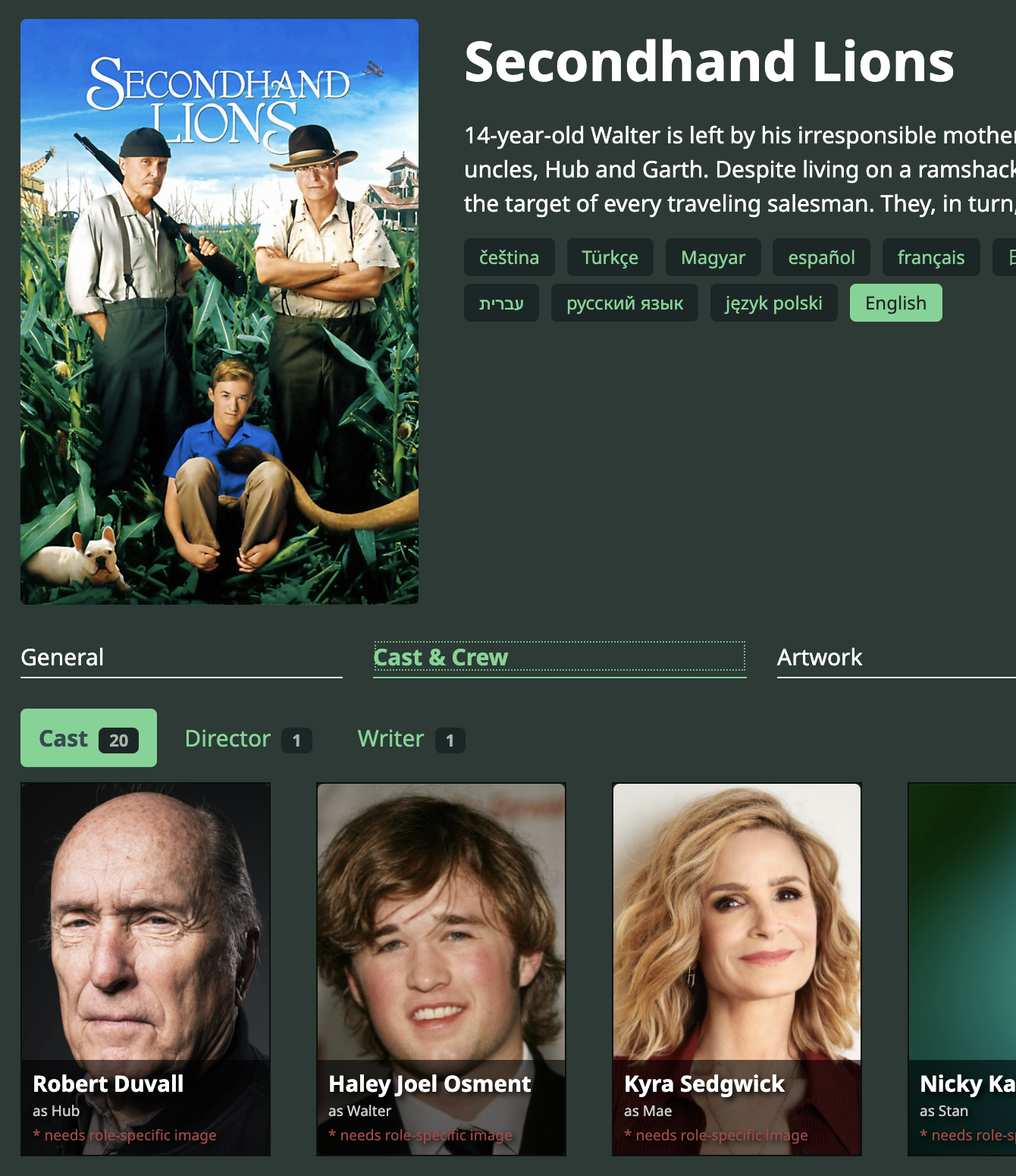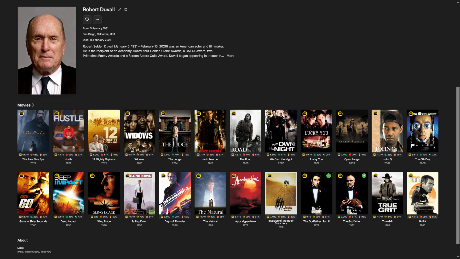 GrimReaper 4739 Posted yesterday at 12:38 PM Posted yesterday at 12:38 PM (edited) That's odd. Do you have multiple movies starring Robert Duvall or only that single one? Edited yesterday at 12:40 PM by GrimReaper