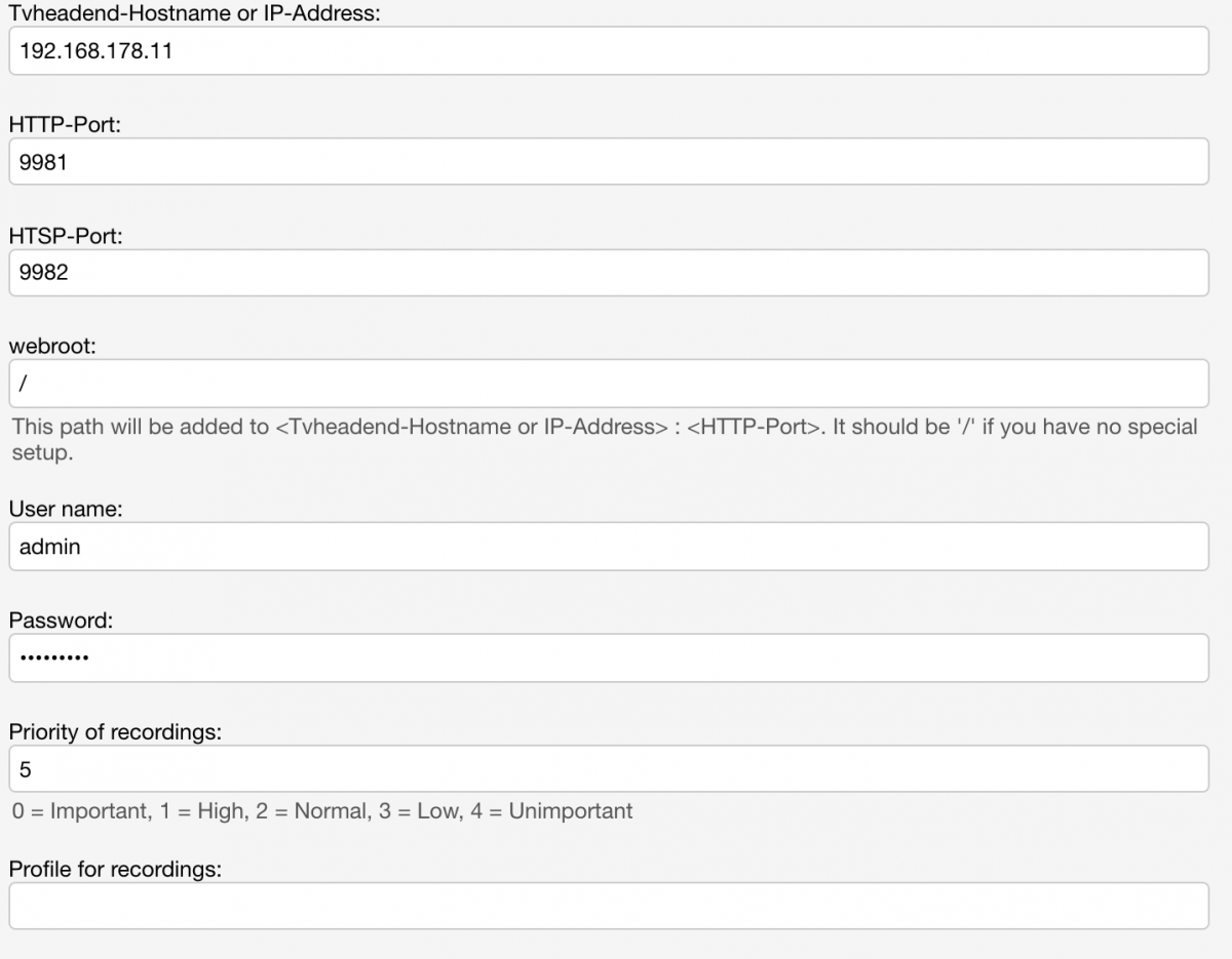 Tolotos 61 Posted October 7, 2016 Author Posted October 7, 2016 (edited) Hi, thanks for your answer. In the Attachment you can see the log files. The error is in the log: 2016-10-06 20:21:41.9255 Info App: [TVHclient] HTSConnectionHandler.ensureConnection: Used connection parameters: TVH Server = '192.168.178.11'; HTTP Port = '9981'; HTSP Port = '9982'; Web-Root = '192.168.178.11:9981'; User = 'admin'; Password set = 'True' You set the new Web-Root parameter to the wrong value. The complete URL will be build like: <server-name>:<port><webRoot> Therefore your URL looks like http://192.168.178.11:9981192.168.178.11:9981 Add a / as Webroot if you don't have redirected the tvheadend server. If your URL is <server-name>:<port>/myredirectpath your Web-Root must be set to "/myredirectpath" -- Tolotos Edited October 7, 2016 by Tolotos