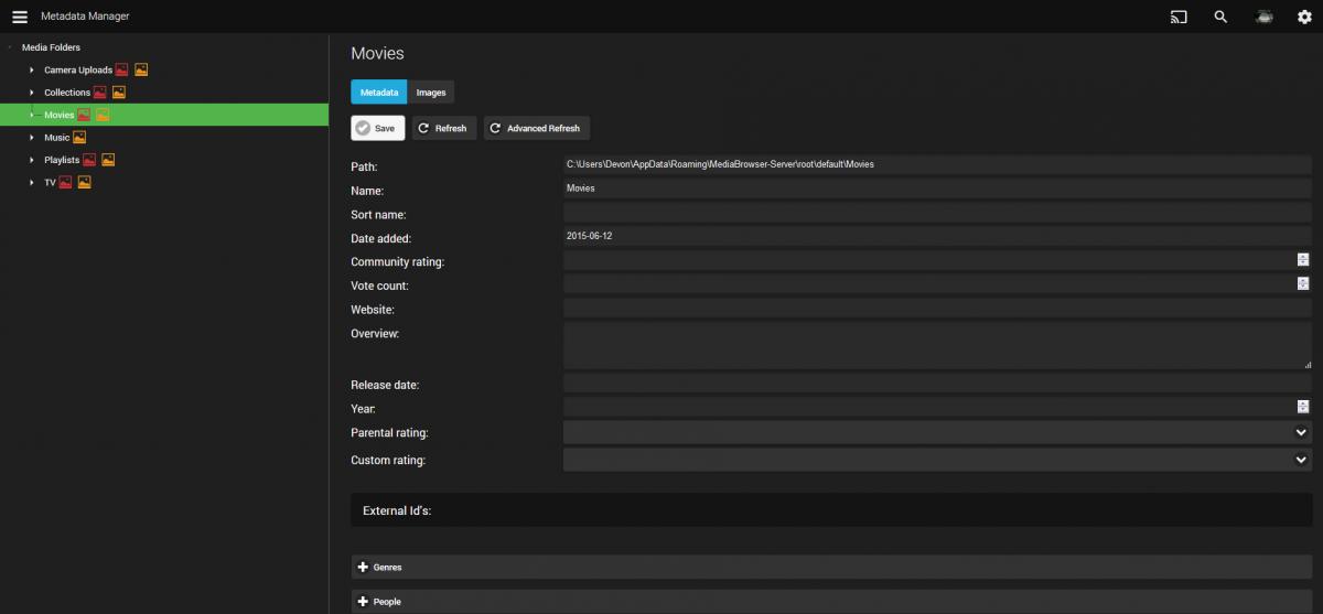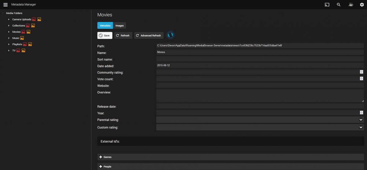 djdevon3 8 Posted June 14, 2015 Author Posted June 14, 2015 (edited) There is no advanced refresh button in manage server>metadata. I have a path setup for local images. Using beta Version 3.0.5641.1 There's no metadata refresh in this metadata manger page either including all the way over to the advanced tab. Maybe I'm missing something but it's just not there. Only time I see advanced refresh is when in metadata manager and clicking on a title. It only refreshes that title. I'm not going to do that 1700+ times for every title in my collection. Edited June 14, 2015 by djdevon3