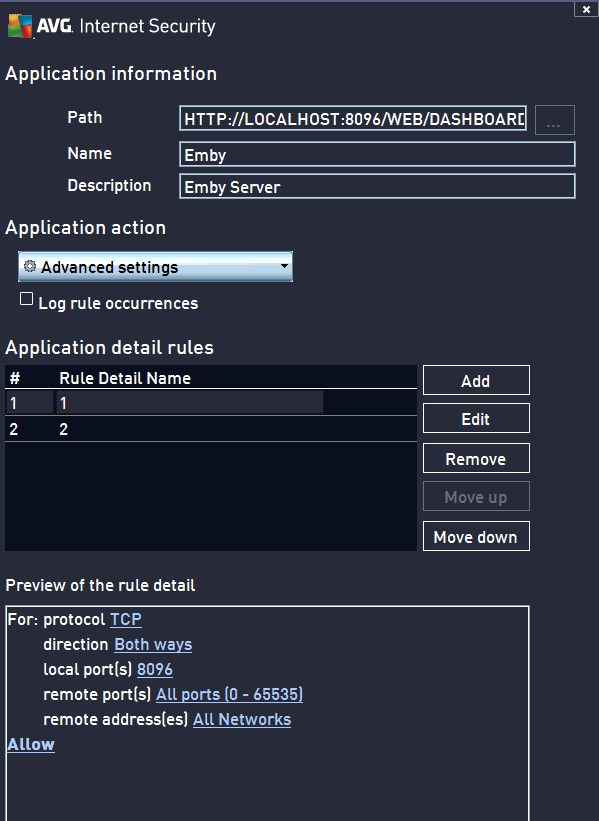 TheKings 0 Posted September 24, 2015 Author Posted September 24, 2015 Here is the set up for AVG Internet Security Firewall: I have these two rules set up on each of the three emby listiings. Is this correct?