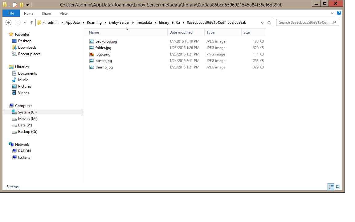 Luke 42078 Posted January 27, 2016 Posted January 27, 2016 if you open the detail page you'll see the id on the query string in the browser. Ā please open the server's program data folder, then navigate to /metadata/library. Then locate the sub-folder for that id. First there will be a folder based on the first two characters, then another layer with the full id. please post a screenshot of the contents of the folder. thanks.