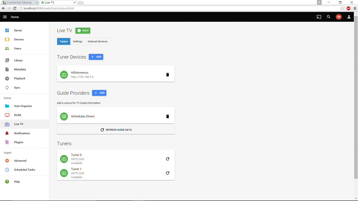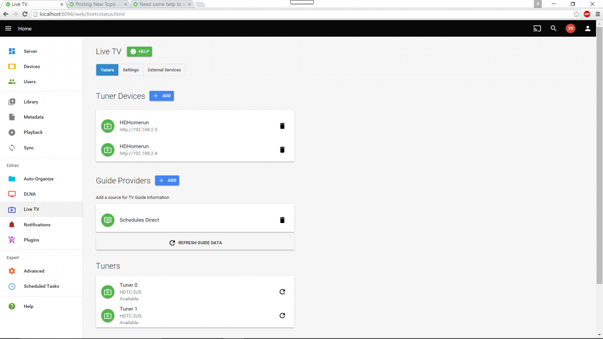 ls3 0 Posted March 13, 2016 Author Posted March 13, 2016 I checked the Live TV and it showed two HDHomerun (I only have one) and four tuners. So I erased the HDHR ending in .5 (Router shows the HDHR in .4). I did not resolved my issue. I still have the same error loading the guide and my option to record shows is missing Emby Log-2 031216.txt