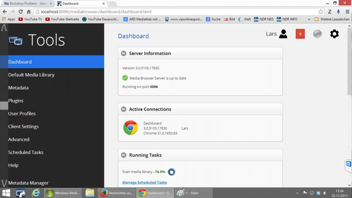 charliekay74 0 Posted December 28, 2013 Author Posted December 28, 2013 Dashboard Server Informationclick to collapse contents Version 3.0.5105.17830 Media Browser Server is up to date Running on port 8096 Active Connectionsclick to collapse contents Dashboard 3.0.5105.17830 Chrome 31.0.1650.63 Lars Media Browser Theater 3.0.5097.22952 WOHNZIMMER-PC Lars Restart MB Server Restart MB Server Shutdown MB Server Shutdown MB Server Linksclick to collapse contents Community Github Interactive Api Documentation Server bookmark: http://localhost:8096/mediabrowser System Pathsclick to collapse contents Logs: C:\Users\Lars\AppData\Roaming\MediaBrowser-Server\logs Images by name: C:\Users\Lars\AppData\Roaming\MediaBrowser-Server\ImagesByName